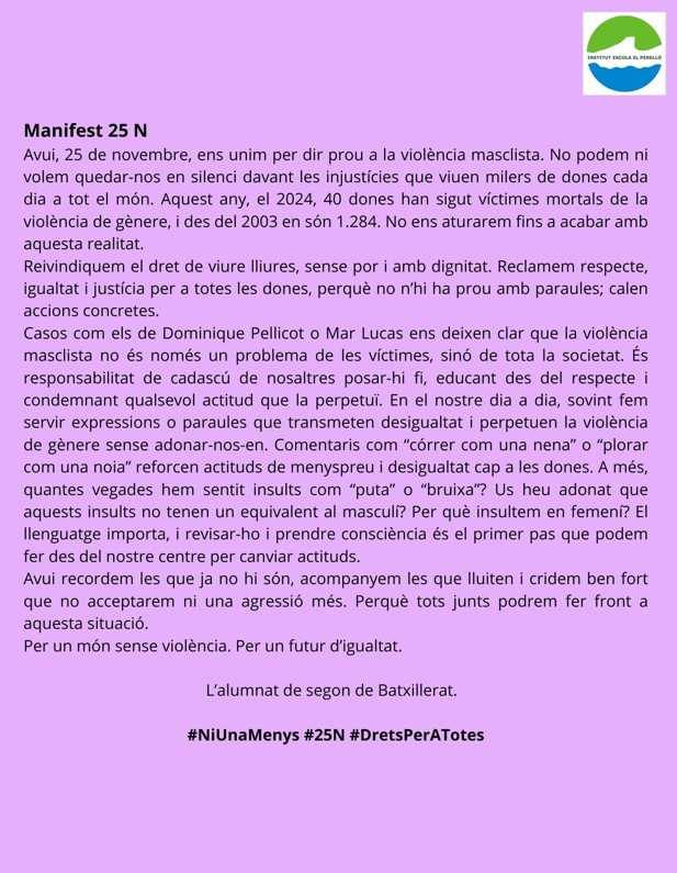 Des de tota la comunitat educativa ens sumem al manifest de l’alumnat de 2n de Batxillerat: per un món sense violència, per un futur d’igualtat.