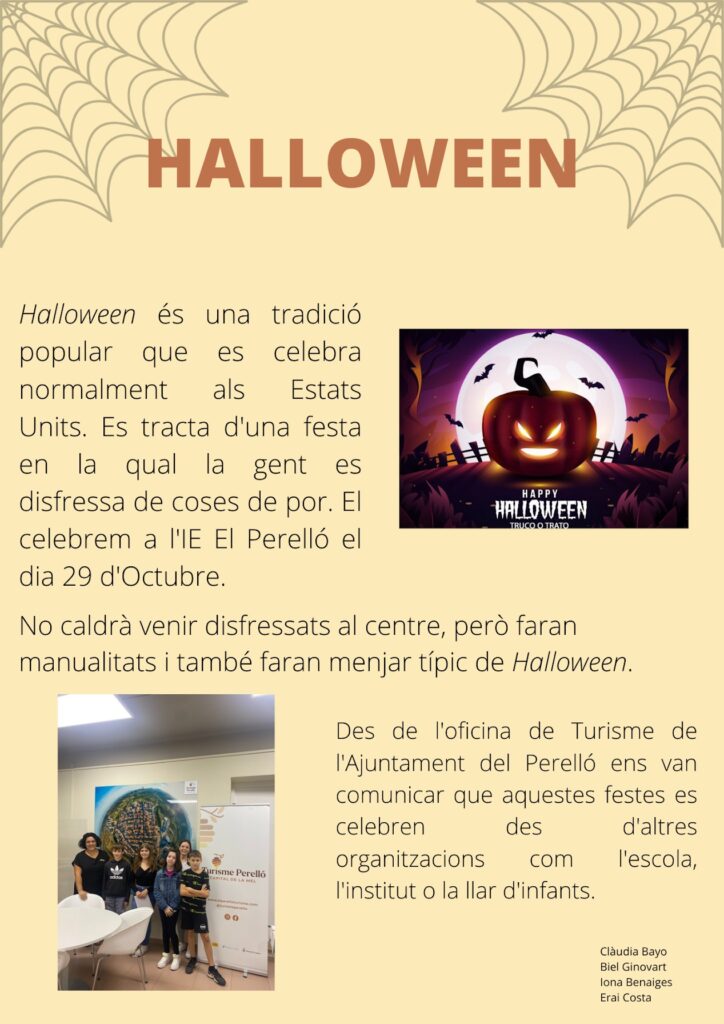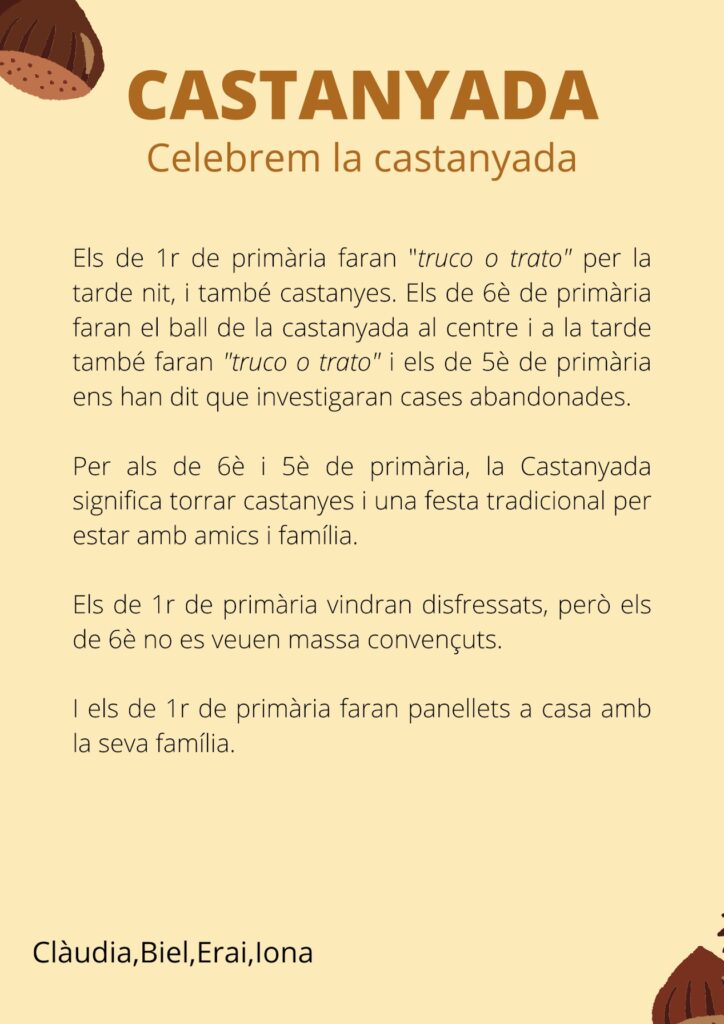 La Castanyada i Haloween al nostre centrePer IE / 27 d'octubre de 2022 / Portada Revista digital: La Roca Blanca / Castanyada, halloween, IE El Perelló, La Roca Blanca, panellets, Tradicions Article sobre la celebració de la Castanyada i Halloween al nostre centre. Com celebra el nostre alumnat aquestes festes? Publicat per: Iona, Biel, Clàudia i Erai de 1r d’ESO B.
