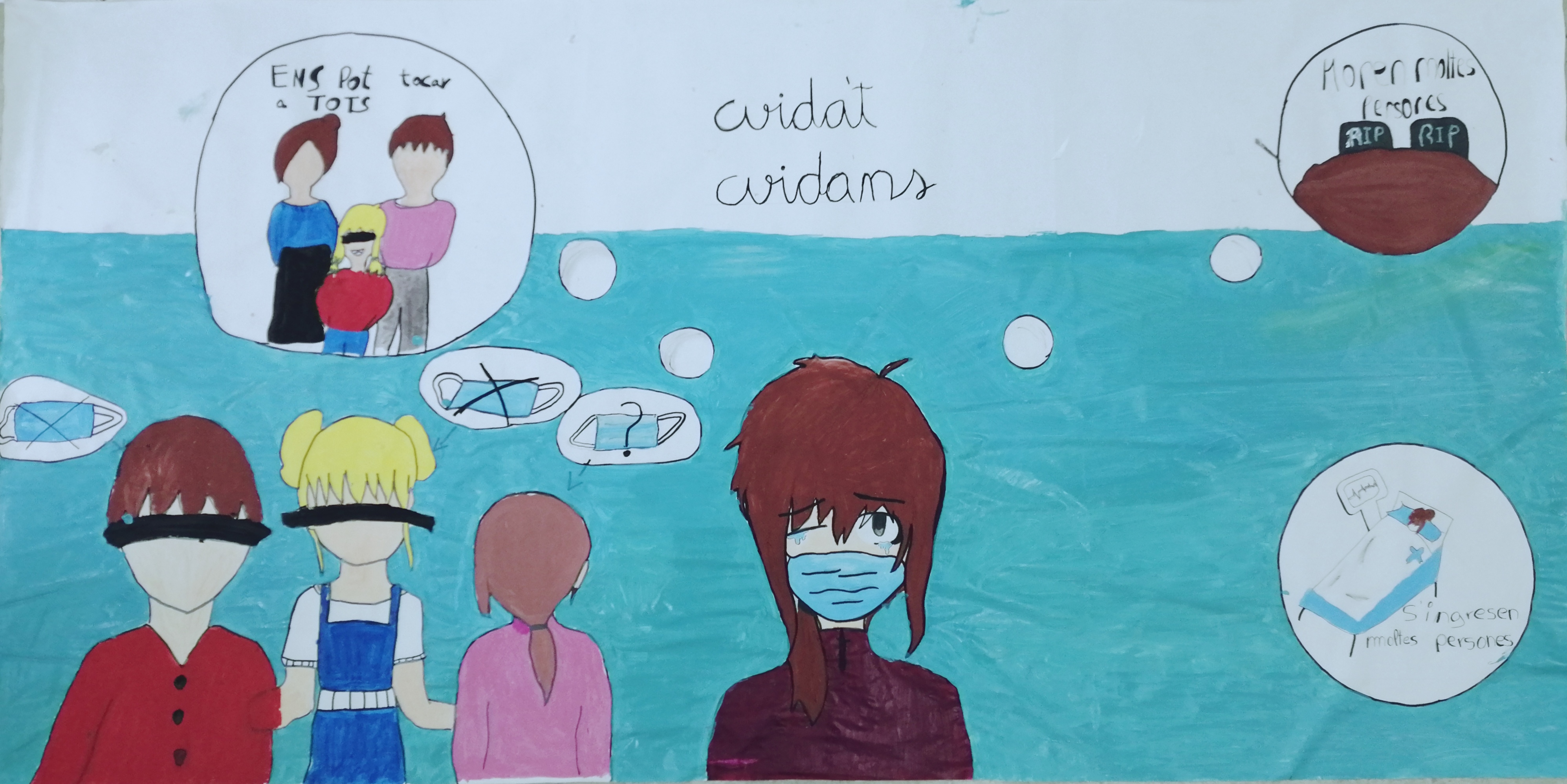 Els alumnes de 1.ESO i 4.ESO participen novament al concurs PINTA LA MARATÓ de Tv3, realitzant a la matèria d’E.V.P distints murals. Amb aquestes obres, volen transmetre la seua preocupació davant la difícil situació que estem vivint provocada per la Covid-19. Cadascun dels murals manifesta un missatge distint. Entre ells destaca la importància de les mesures de seguretat front al virus.