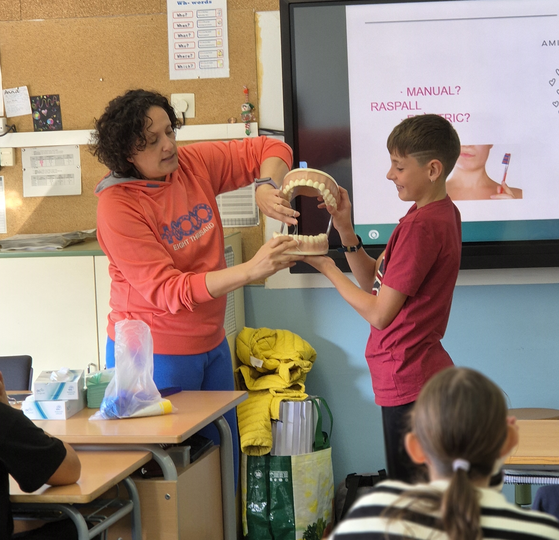 Aquesta setmana hem rebut la visita al centre de dues higienistes per ensenyar a l’alumnat de 6è com pot millorar la seva salut bucodental. Hem pogut comprovar com ens rentem les dents i què podem fer per millorar-lo.
