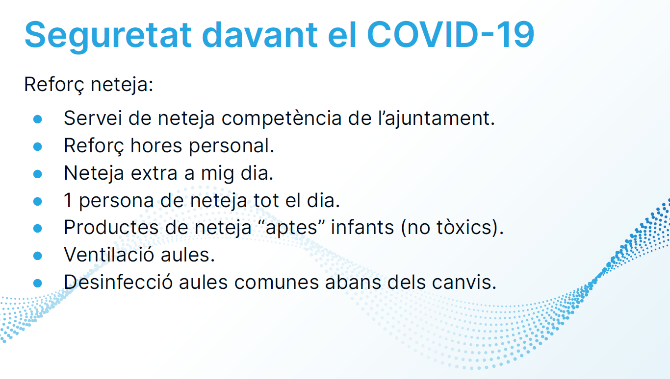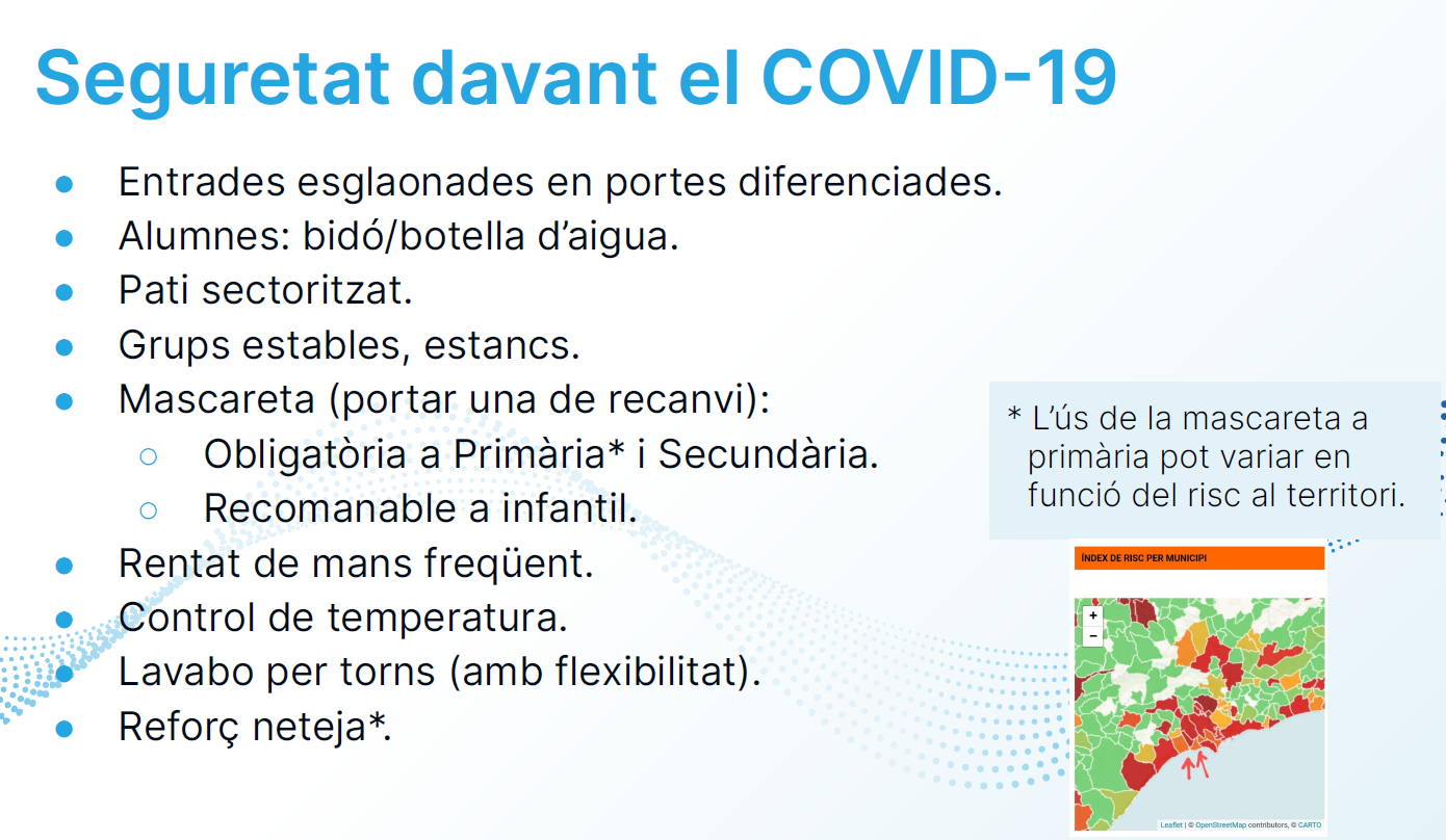 Ja ho tenim tot a punt perquè comenci el nou curs escolar. Estem molt il·lusionats per tornar a les aules. volem fer-ho molt bé i que tothom se senti segur i amb confiança. Hem elaborat un pla d’obertura que contempla diverses mesures de seguretat front al COVID-19, com entrades esglaonades, grups estables, mascareta, rentat de mans, presa de temperatura,ús del lavabo, reforç del servei de neteja… totes elles seguint les instruccions que el Departament d’Educació i el de Salut ens han donat.
