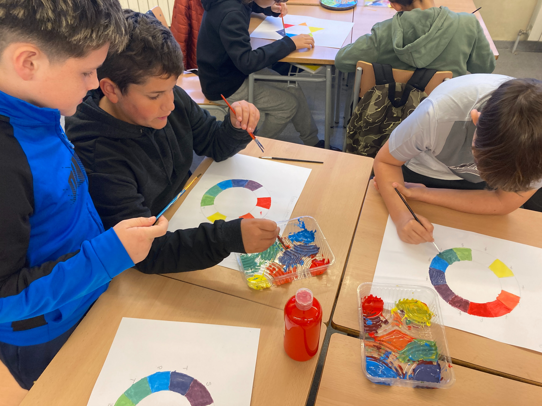 Ara, després d’haver vist els vídeos dels colors primaris, secundaris i terciaris vam fer un cercle cromàtic. Per fer el cercle cromàtic vam haver d’agafar un full D3 i fer un cercle. La forma era com la d’un dònut (un altre cercle més petit al mig) i fer 12 espais per poder posar els colors primaris, secundaris i terciaris a cada lloc que pertoquen.