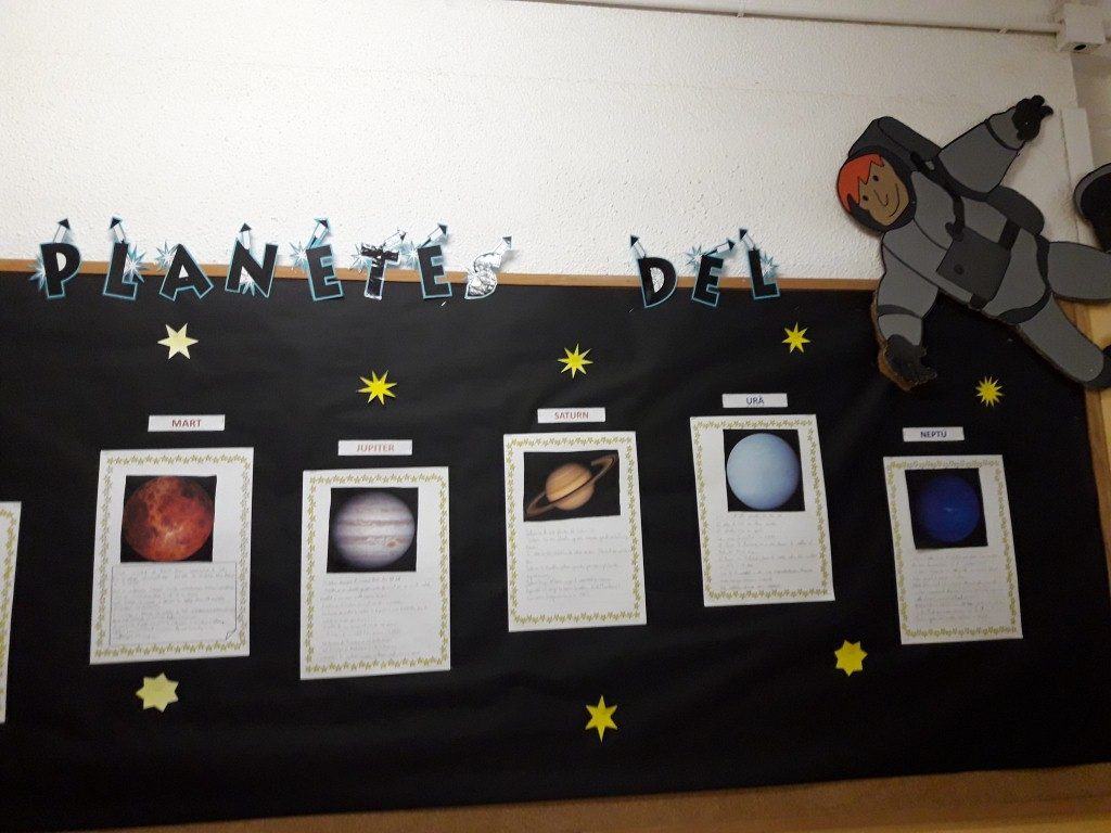 Els alumnes  de 4t estem estudiant l’Univers. Una de les coses que hem fet ha estat buscar informació sobre els planetes i els hem reproduït amb plastilina. El que més ens ha costat ha sigut fer-los proporciona’ls a la seva mida real. Un cop acabat ho hem penjat tot al passadís.