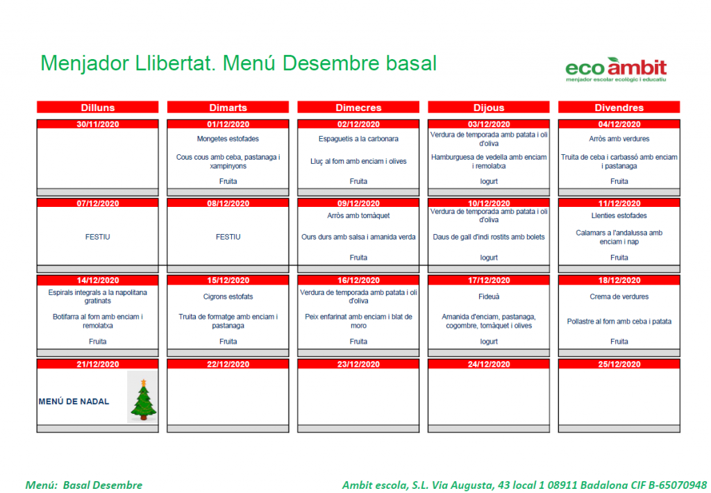 Benvolgudes famílies, aquí us deixem el nou telèfon dels responsables del menjador escolar. Qualsevol dubte us podeu posar en contacte amb ells. Telèfon menjador IE Llibertat: 653821492 Moltes gràcies Us pengem el menú del mes de desembre. Si voleu conèixer el menú de l’últim dia que serà especial cliqueu Menú de Nadal 2020.