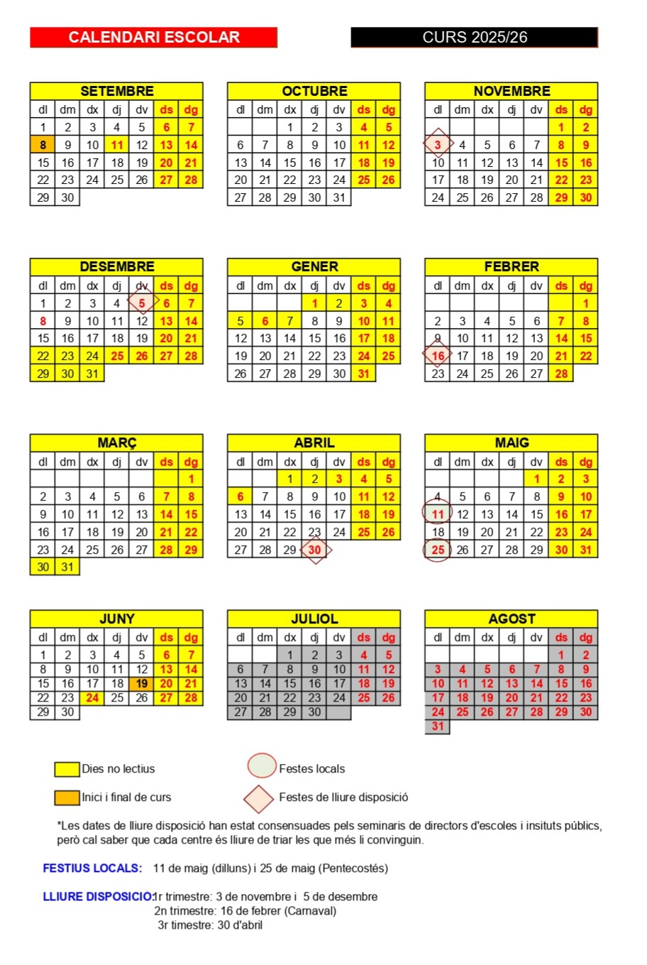 Aquest curs el calendari de treball serà, tal com regeix el Departament d’Ensenyament, del 8 de setembre de 2025 al 19 de juny de 2026, ambdós inclosos en el cas d’Educació Infantil i primària i Secundària.
