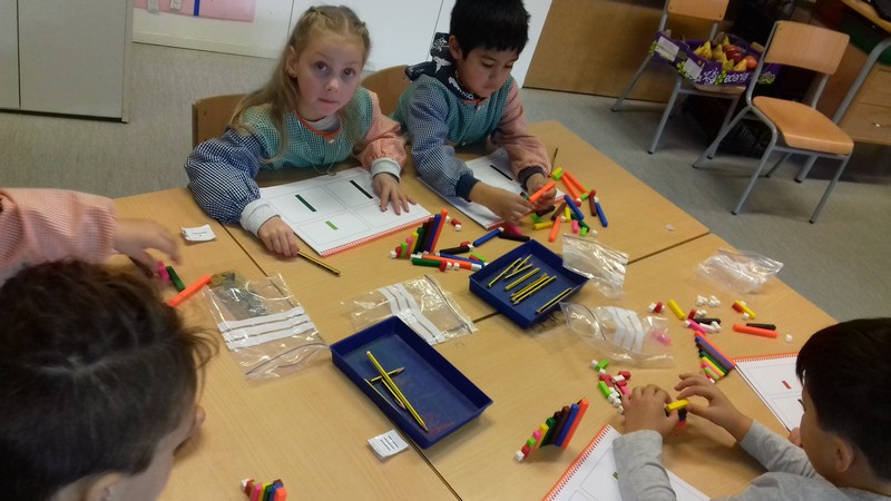 Juguem amb els reglets a P5 cicleinfantil06/03/19 Continuem jugant amb les matemàtiques i els reglets (de Cuisenaire). Estem relacionant, número, nombre i reglet i després de muntar l’escala de l’1 al 10, hi juguem molt i identifiquem els colors amb el nombre.