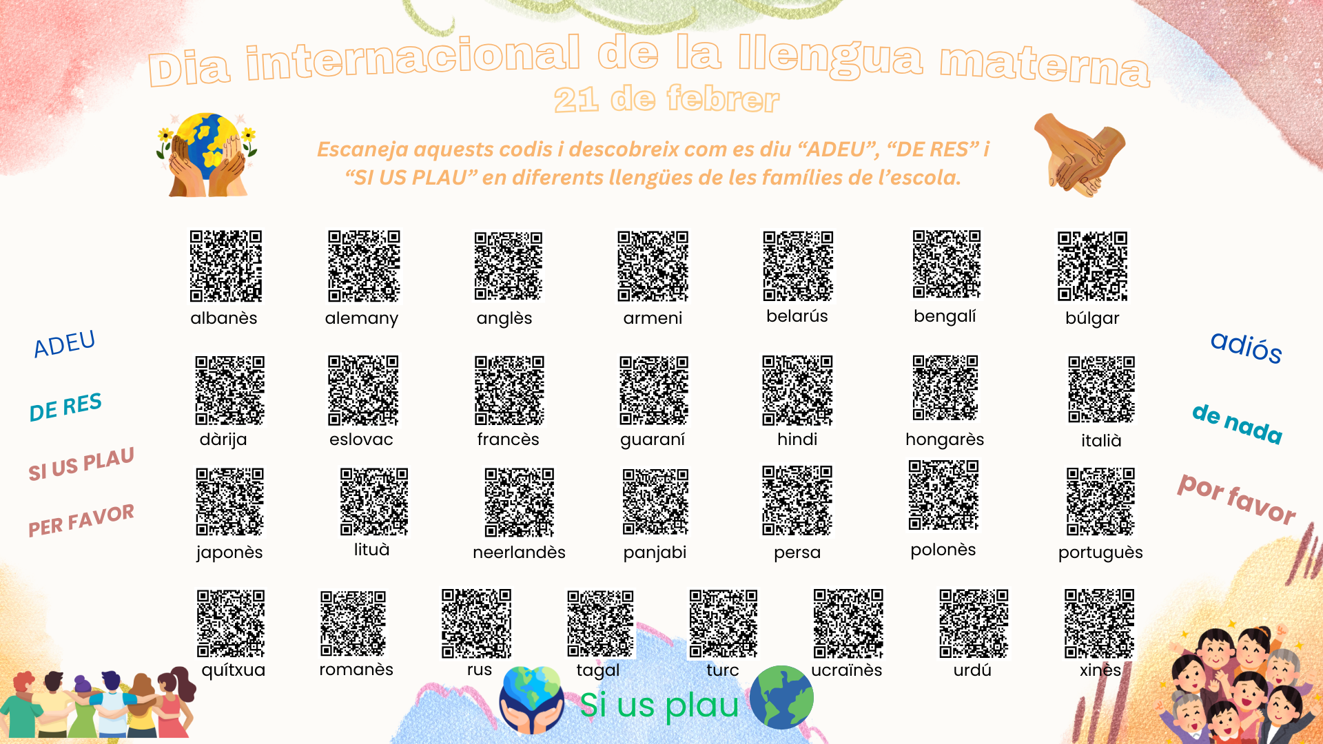 Escaneja aquests codis i descobreix com es diu “ADEU”, “DE RES” i “SI US PLAU” en diferents llengües de les famílies de l’escola.