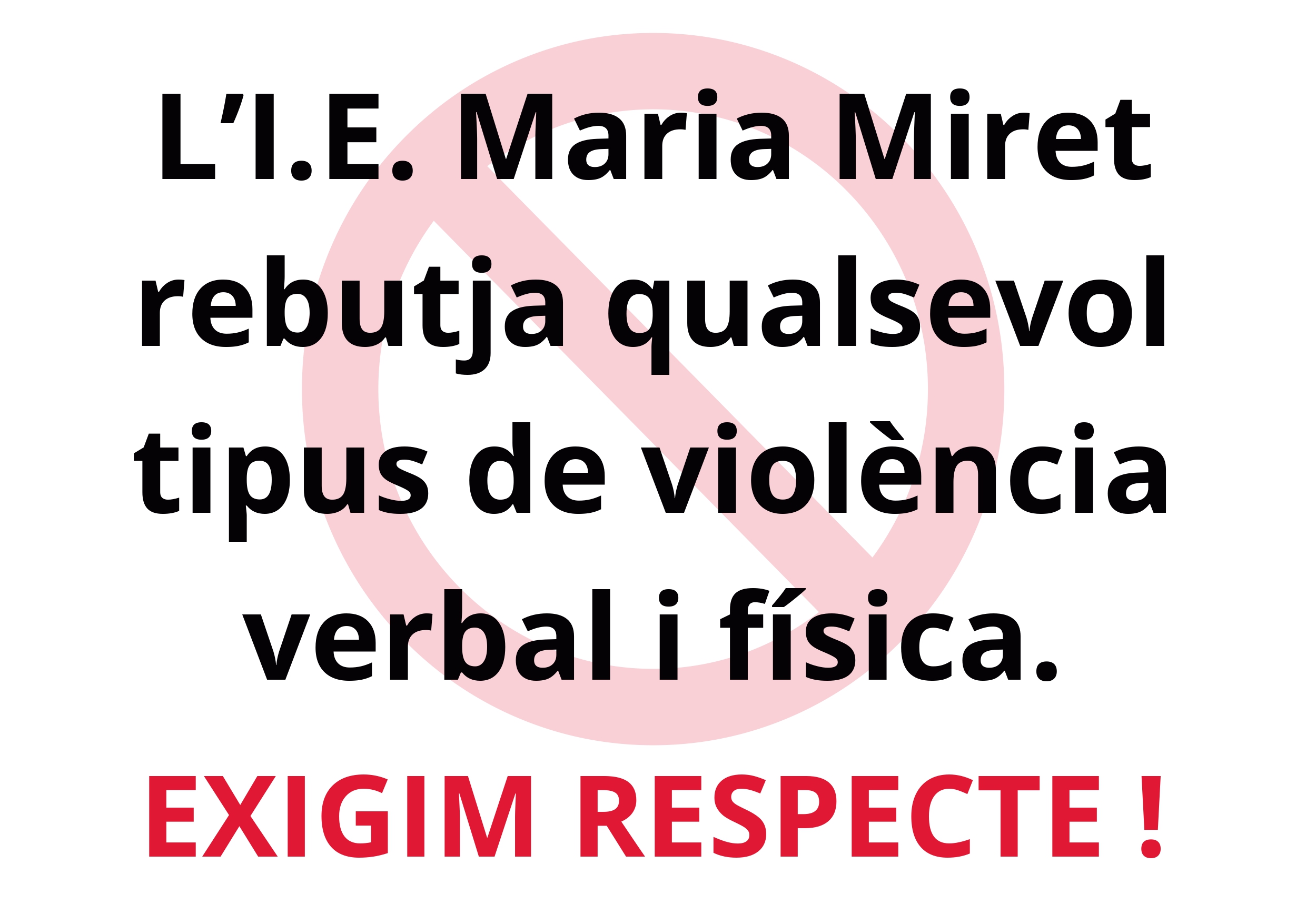 El Claustre de l’Institut Escola Maria Miret, que inclou l’Equip Directiu i el conjunt de professors i professores del centre, volem informar a tota la comunitat educativa que avui dia 24 de febrer s’ha produït una agressió molt greu a una mestra per part de la família d’una alumna. Davant d’aquests fets, volem remarcar que […]
