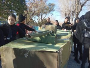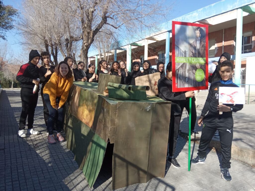 Com podeu veure a les imatges, els nois i noies van construir un enorme tanc i es van dividir en dos grups. Els alumnes que representaven “Crimen” es van amagar dins del tanc i, els que representaven “Castigo” anaven fora.