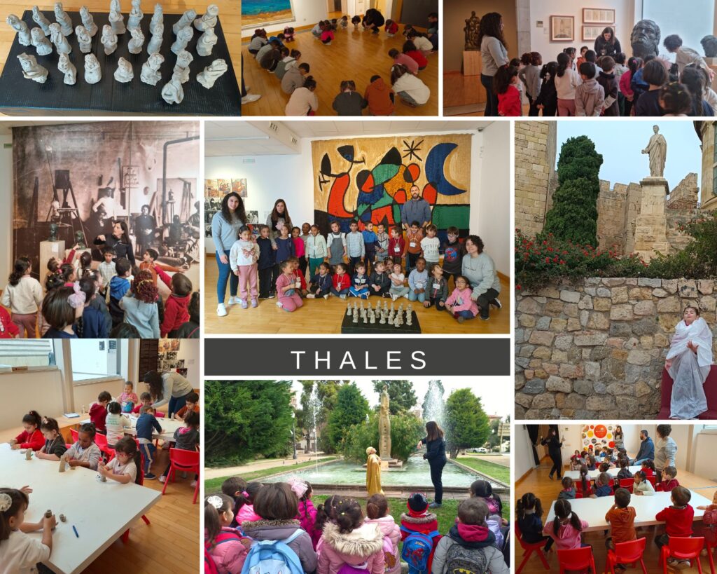 D’una banda P4 i P5 van engegar la visita al parc, davant l’escultura de Thales, de Lluís M. Saumells. Van observar-lo i fins i tot algun es va disfressar, per anar després fins el museu on van fer una activitat psicomotriu i on van experimentar amb el bronze. Finalment van treballar el fang per fer la seva pròpia escultura de Thales.