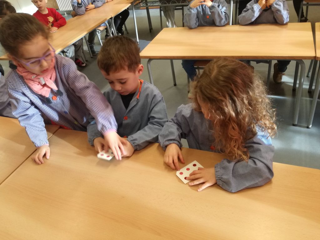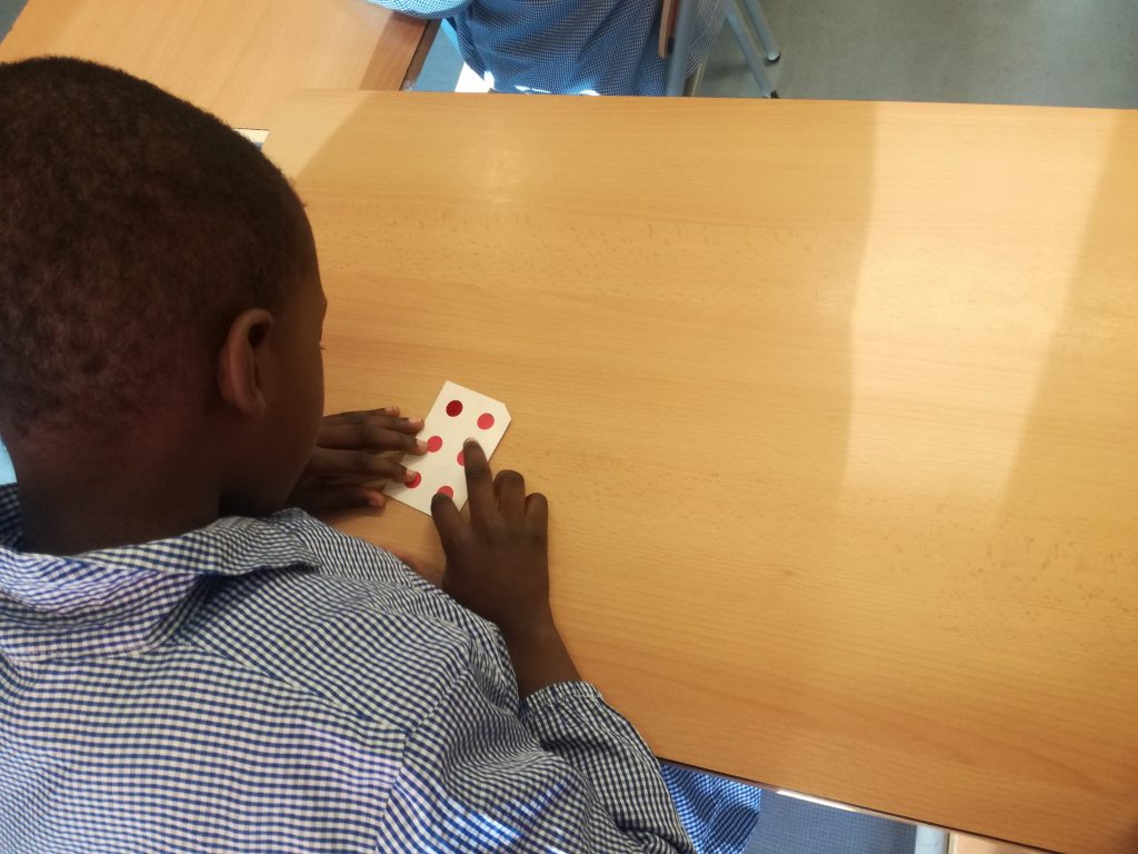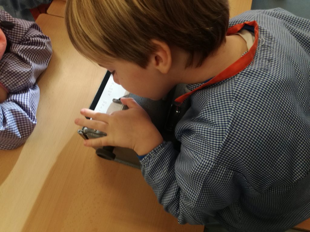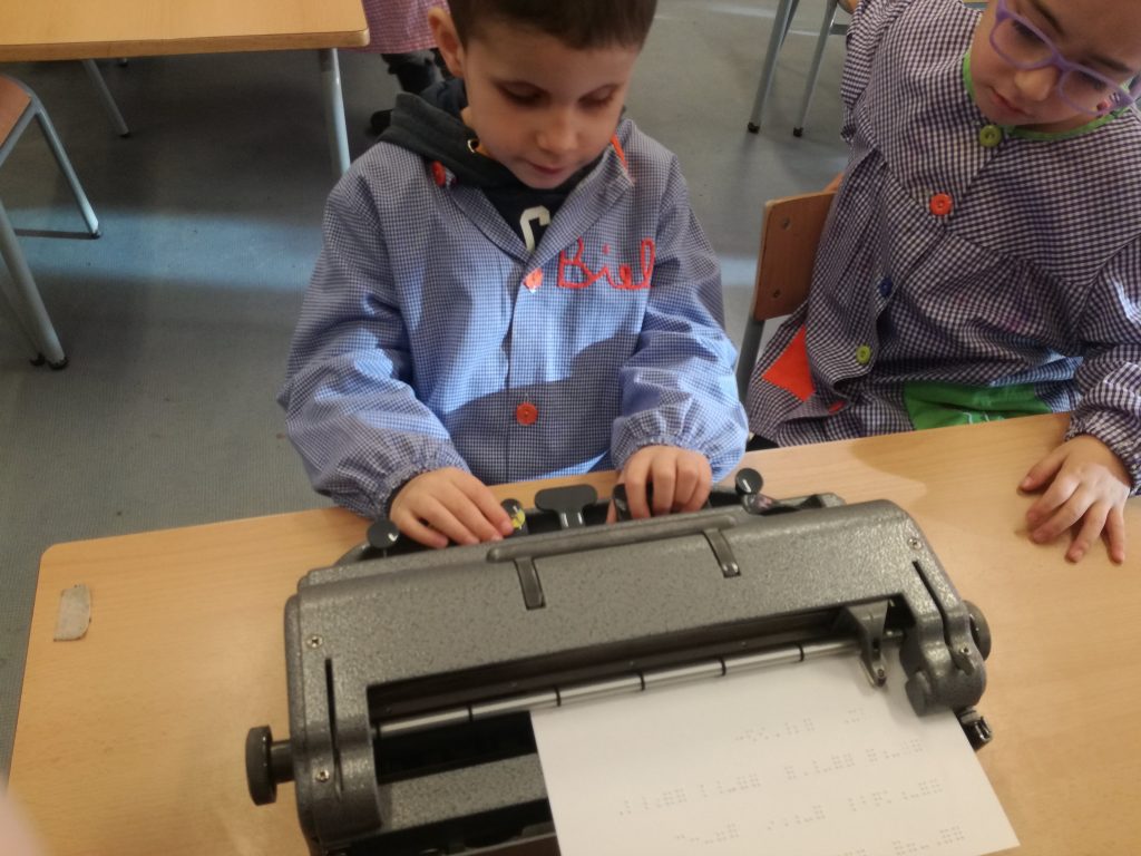 Fa uns dies, vam dedicar un matí a saber com aprèn el nostre company Biel a llegir i a escriure amb el sistema Braille. La Núria del CRDV ens va explicar en què consisteix aquest codi. Nosaltres el veiem cada dia, aquest sistema, però ens va agradar molt provar de practicar-lo nosaltres. A en Biel, també li van arribant lletres com a nosaltres i està aprenent a llegir molt bé! El sistema Braille és un codi basat en 6 punts. Per exemple, el punt 1, el de dalt a l’esquerra, és la lletra A, la lletra B es representa amb el punt 1 i 2…Aquests punts tenen relleu perqué puguin ser llegits a través del tacte. Per escriure fem servir la màquina Perkins que té 6 tecles que representen els 6 punts.
