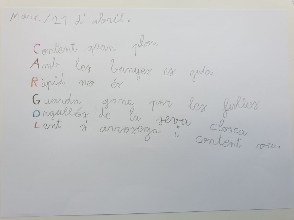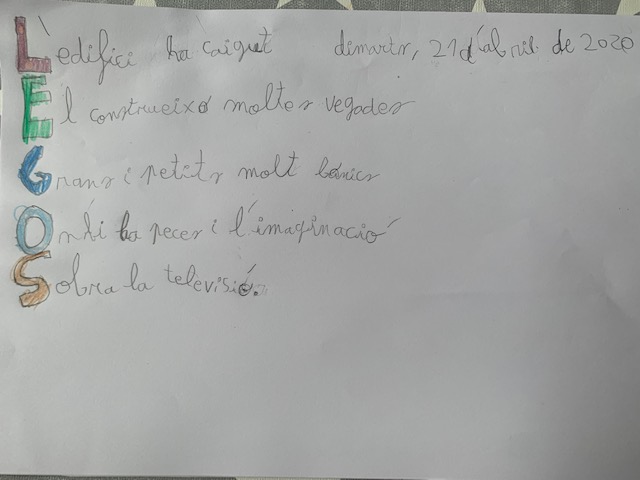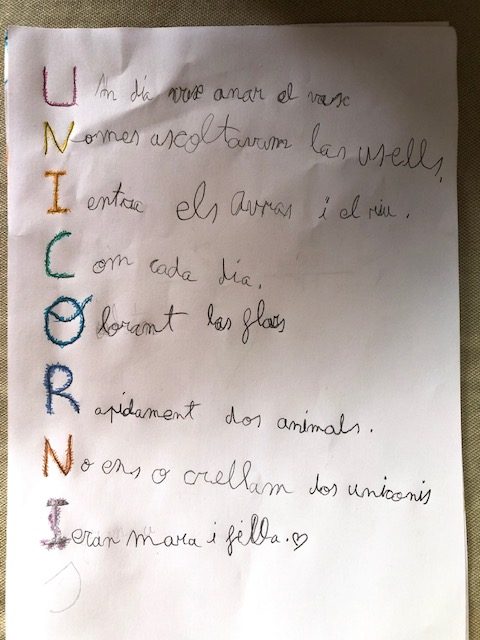 Acròstics de primer. Juguem amb la llengua!! admin01/05/20 Ho sabíeu que les paraules amaguen vida a dintre? Sabeu què hi ha a dintre d’ÀXEL… o d’UNICORNI? Són els acròstics del nostre alumnat de primer de primària! Bona feina, nenes i nens!! hdrpl