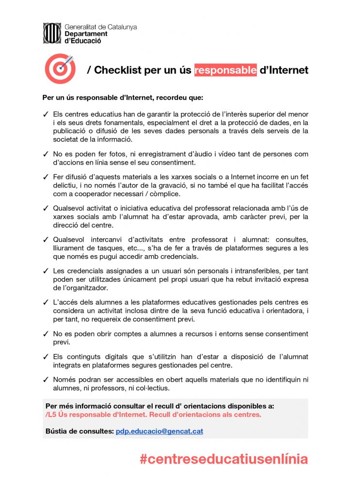 INFORMACIÓ D’INTERÈS PER TOTA LA COMUNITAT admin28/04/20 Des del Twitter d’educació ens recorden un seguit d’orientacions per garantir la protecció de l’alumnat durant les comunicacions virtuals d’aquest tercer trimestre.