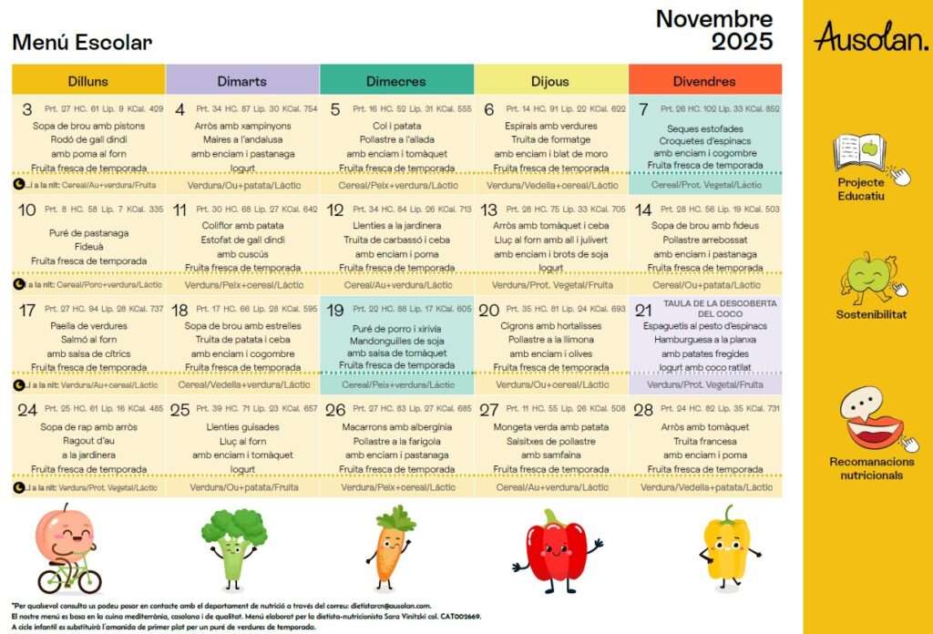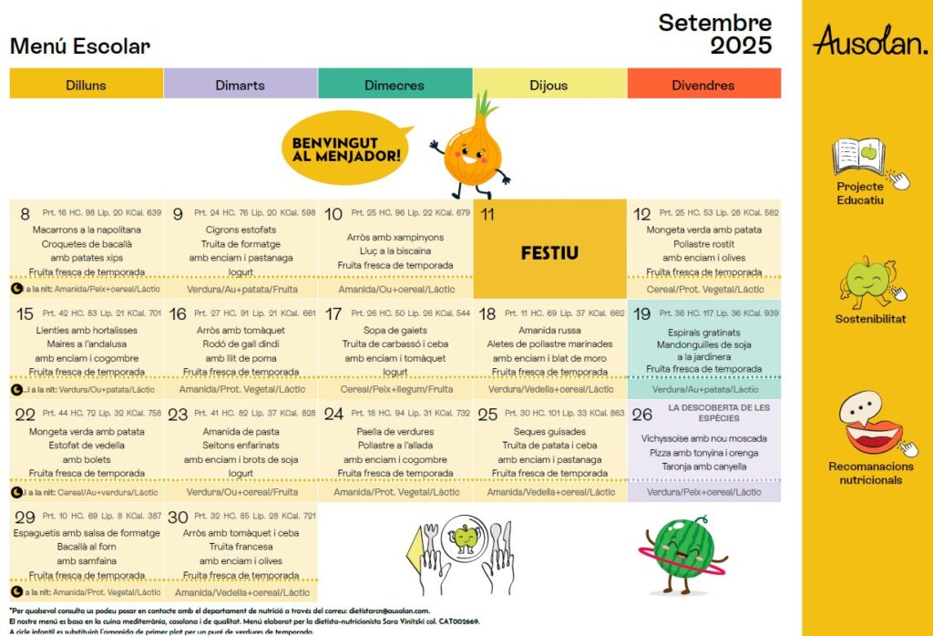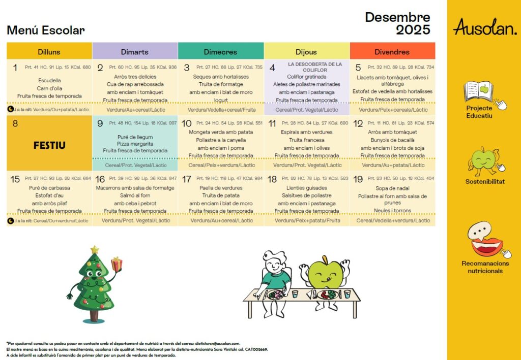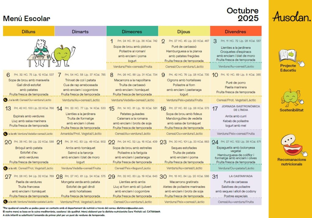 Menú del menjador Feu un comentari / Per admin / 15 de setembre de 2025 / 1r 1r ESO 2n 3r 4t 5è 6è General I3 I4 I5 Infantil Portada Primària Secundària / menjador El menú del menjador ja ha estat actualitzat, podeu veure els mesos de setembre, octubre, novembre i desembre!
