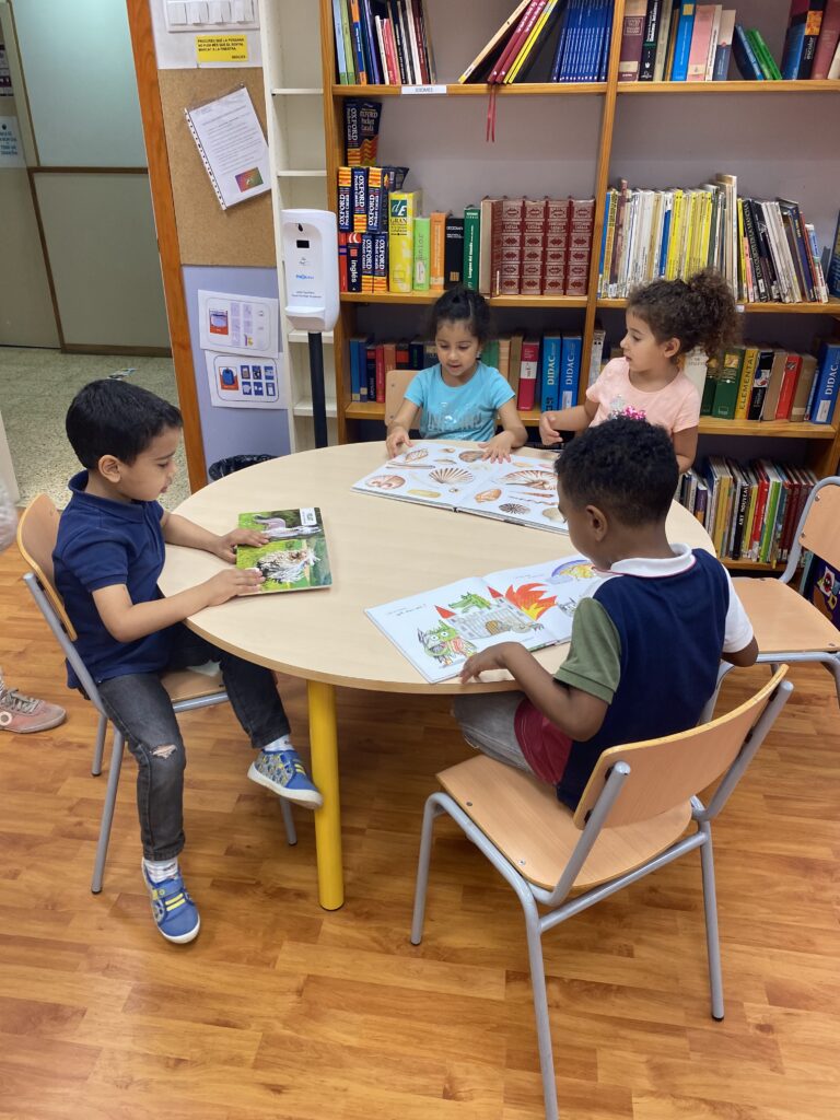Els nens i les nenes de la classe de P5 visiten una vegada a la setmana la biblioteca de l’escola. La Yolanda escull un conte cada setmana per explicar i dramatitzar. Després podem gaudir d’una estona de lectura dels contes i llibres que més ens agraden.