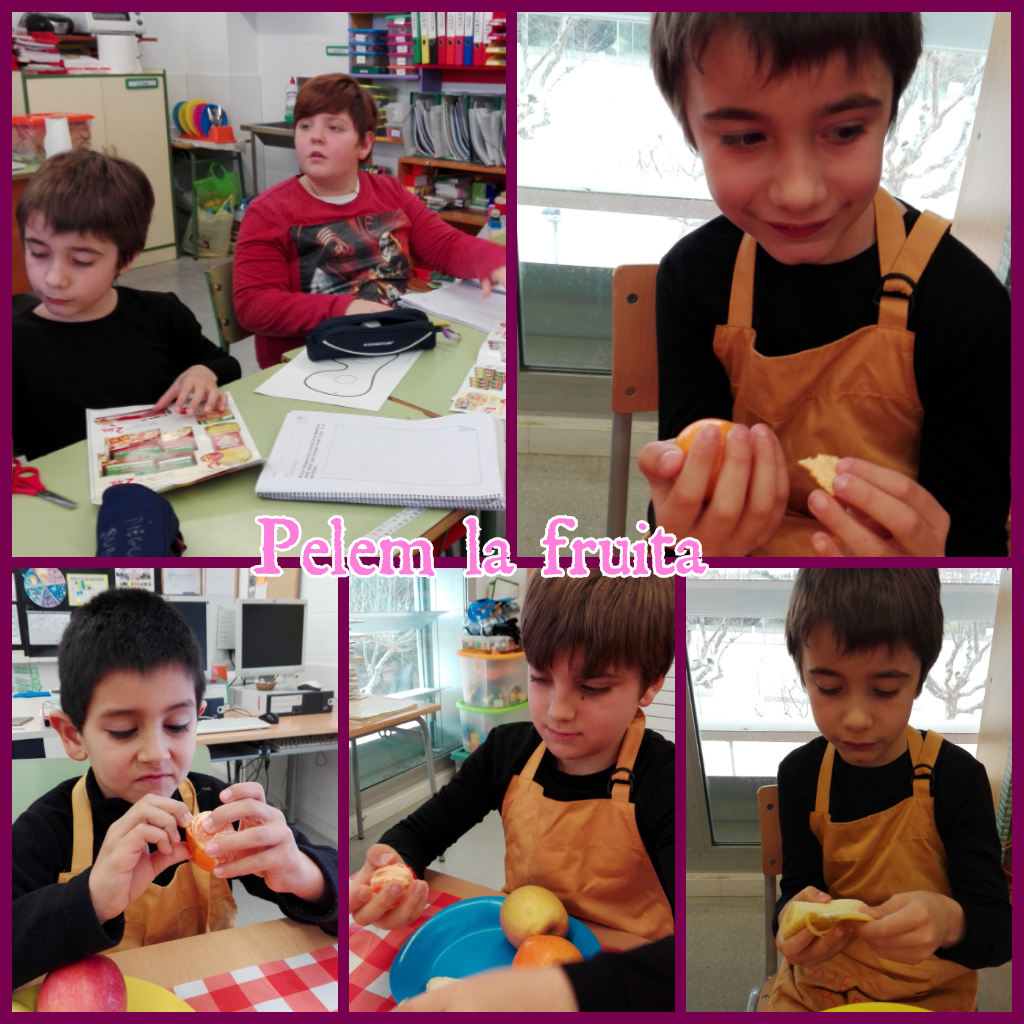 Primer hem endevinat les fruites a partir de descripcions. Després les hem escrit i pintat. Finalment hem retallat fruites dels catàlegs de supermercat.