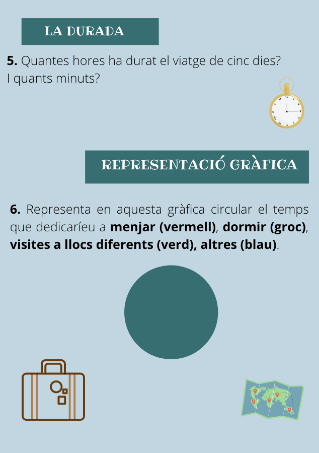 La tasca d’avui de matemàtiques consisteix en calcular el preu de l’allotjament, del menjar i el temps que dedicareu al viatge. Recordeu que cal fer-ho del país que heu escollit.