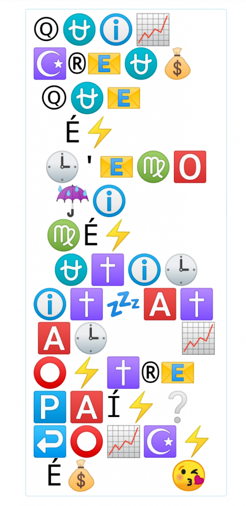 Avui us porto aquesta imatge realitzada amb un programa que transforma les paraules en emojis. És un pel difícil, peró podràs trobar el missatge ocult que hi ha. Podràs esbrinar que hi diu? Molta sort!
