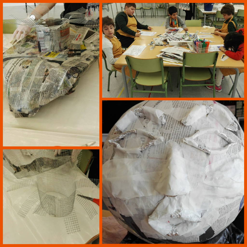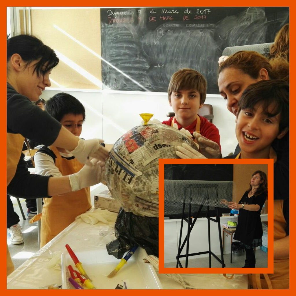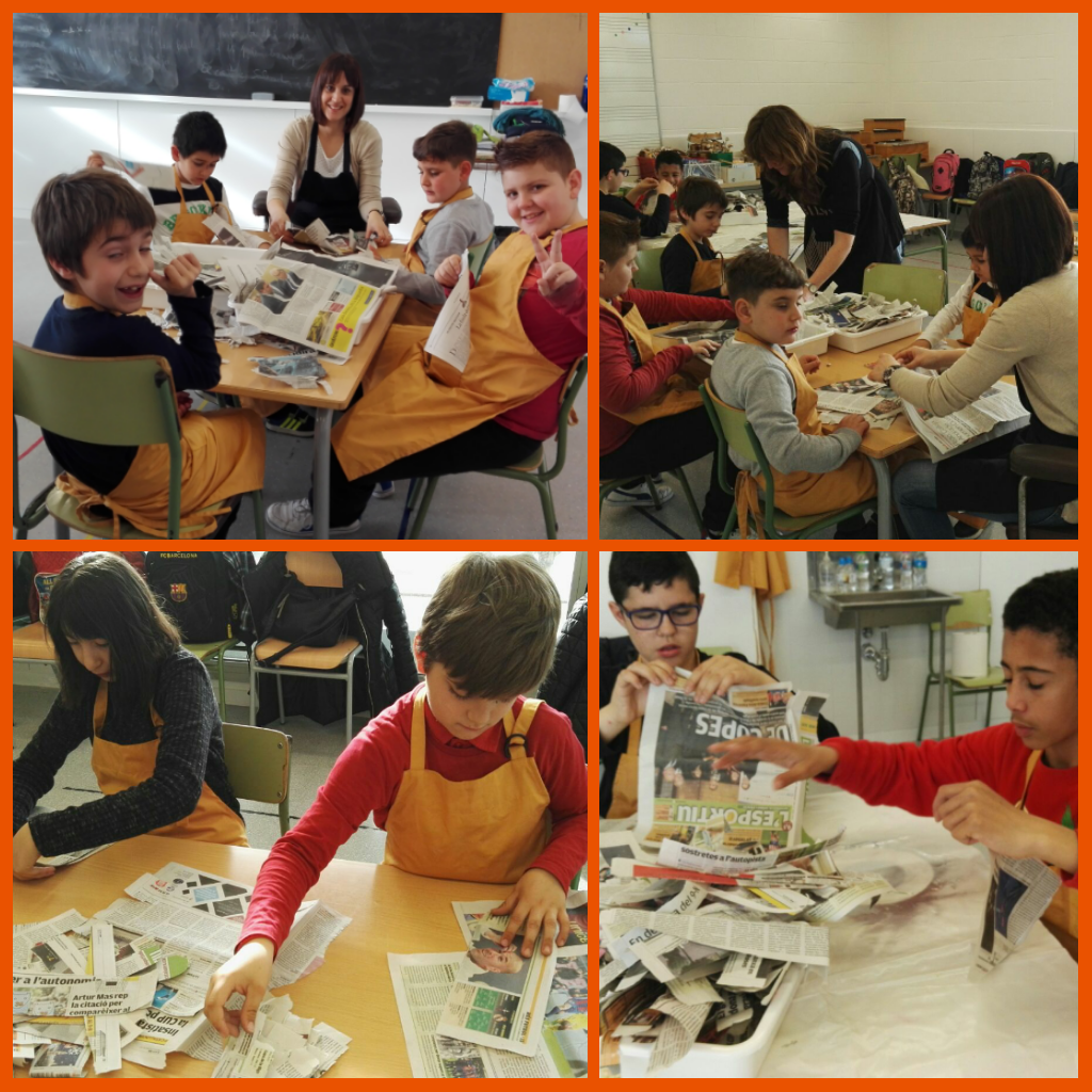 Inflem un globus gran que ens servirà de base. I hi enganxem les tires amb cola d’empaperar. Alguns han utilitzat pinzell i altres s’hi han fet amb les mans. Hi han participat tots els nens i nenes amb moltes ganes!