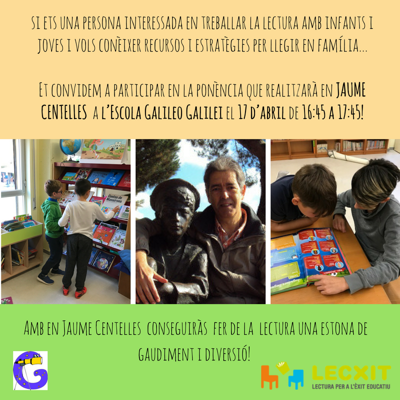 El dimarts 17 d’abril de 16:45 a 17:45h comptarem amb la ponència del Jaume Centelles a l’Escola Galileo Galilei en la que es tractarà el foment de la lectura infantil i juvenil oferint diversos recursos i estratègies per a llegir en família. Aquesta activitat és oberta a qualsevol persona adulta amb interès especial per la lectura. En