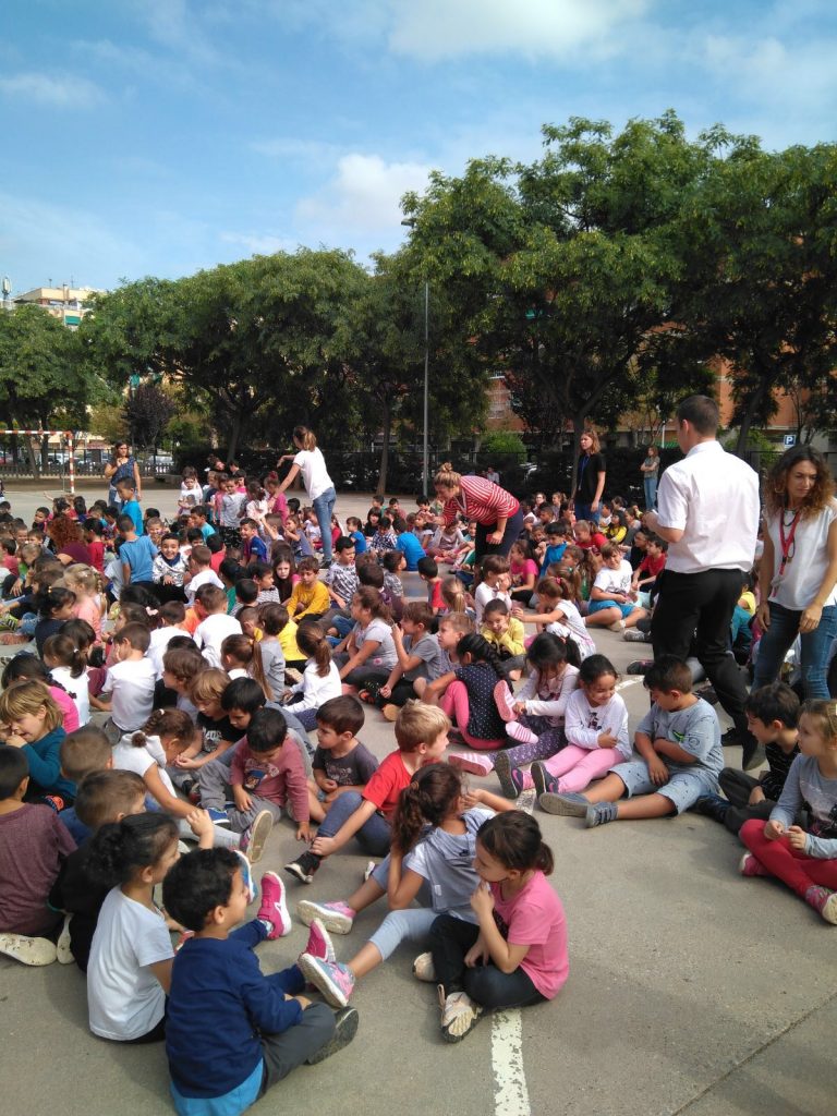 A les 12 hores de DILLUNS 2 D’OCTUBRE, tot l’alumnat i equip de treball de l’Escola Pepa Colomer ens hem reunit al pati per fer una crida a LA PAU I NO VIOLÈNCIA en tots els centres docents.