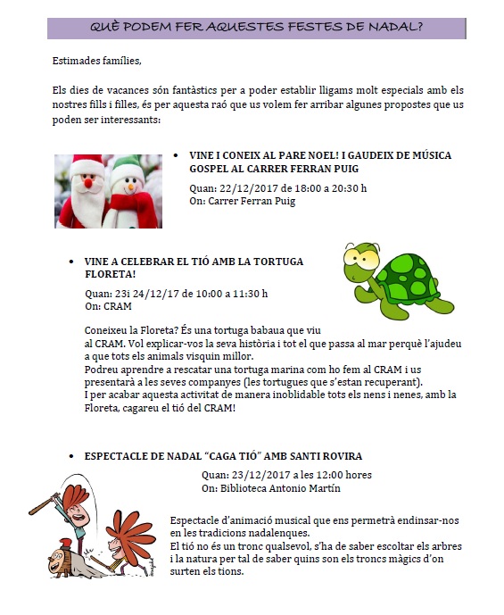 Molt Bones festes a tothom! Us annexem algunes idees per poder gaudir de les meravelloses propostes que es fan en el nostre municipi: