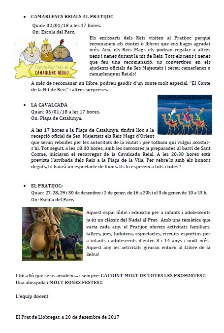 El dia 22 de desembre hem continuat amb les festes nadalenques: Els nens i nenes d’Educació Infantil i Cicle Inicial han fet cagar el Tió, mentre els nois i noies de Cicle Mitjà i Cicle Superior han fet l’amic invisible, hem rebut tots i totes la visita del Patge Reial i hem fet un esmorzar col·lectiu. Tot un ventall de propostes per gaudir d’allò més!