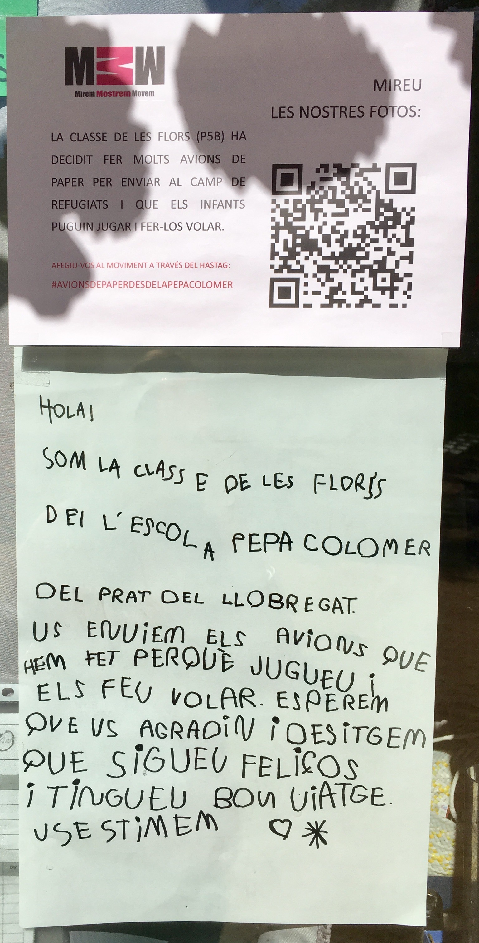 Objectiu complert: els avions de paper ja són al vaixell d’ Open Arms Feu un comentari / Per admin / 10 de gener de 2020 / Petits 2 / P-5 Els avions de paper fets pels alumnes de P5B el curs passat ja han estat entregats al vaixell d’Open Arms. Aquests avions plens de bons desitjos són de camí al seu destí, on els nens refugiats compartiran il·lusions.