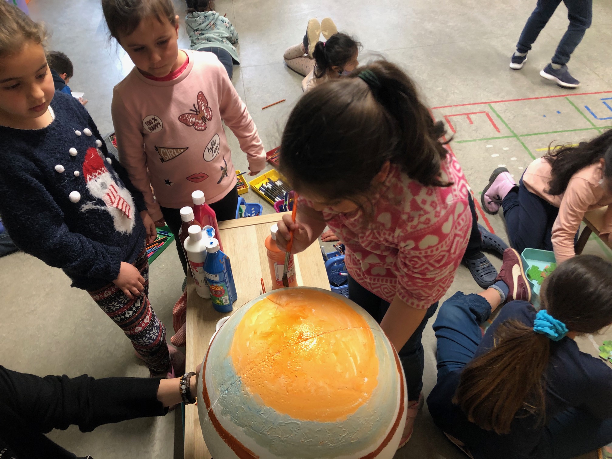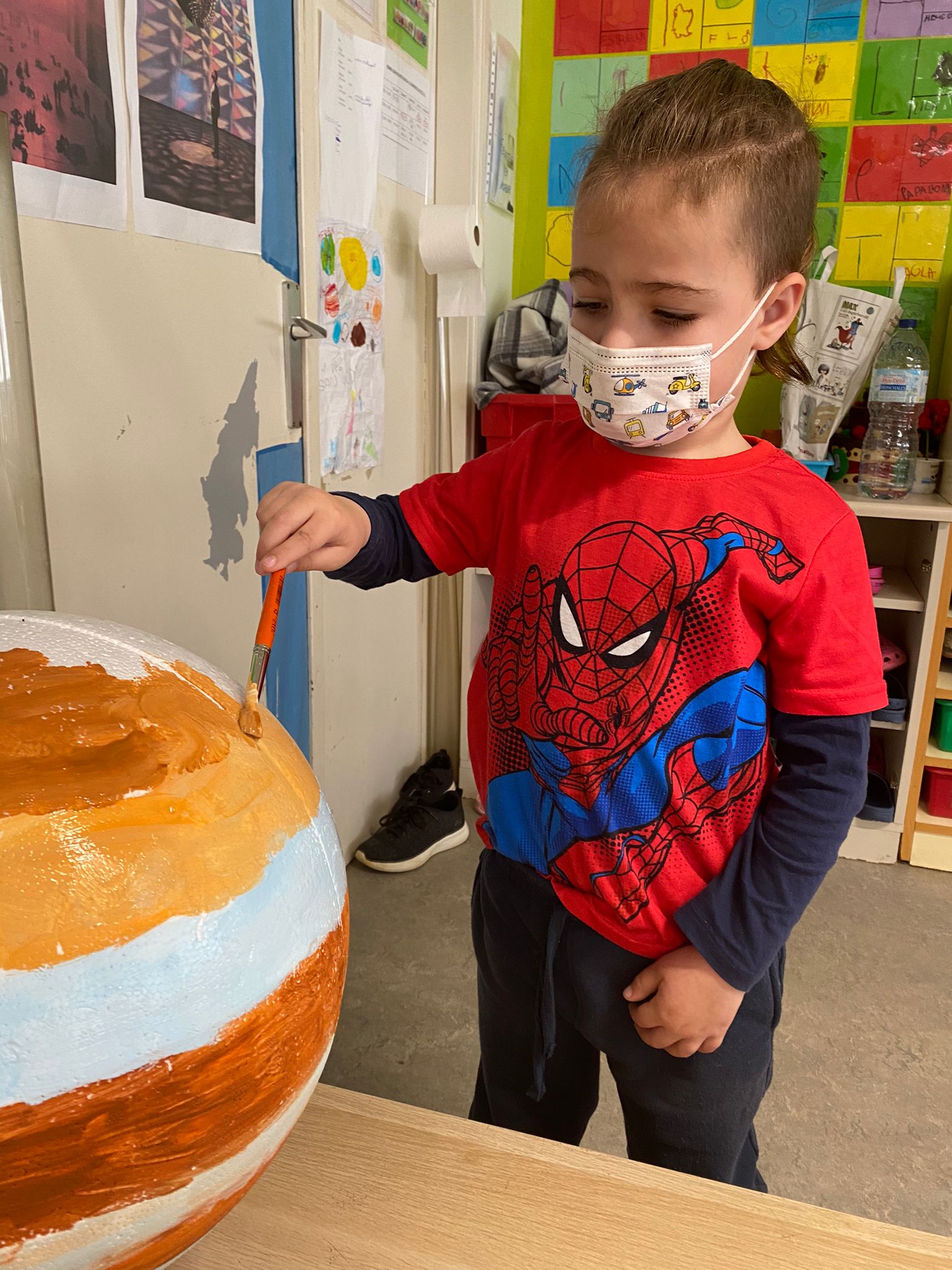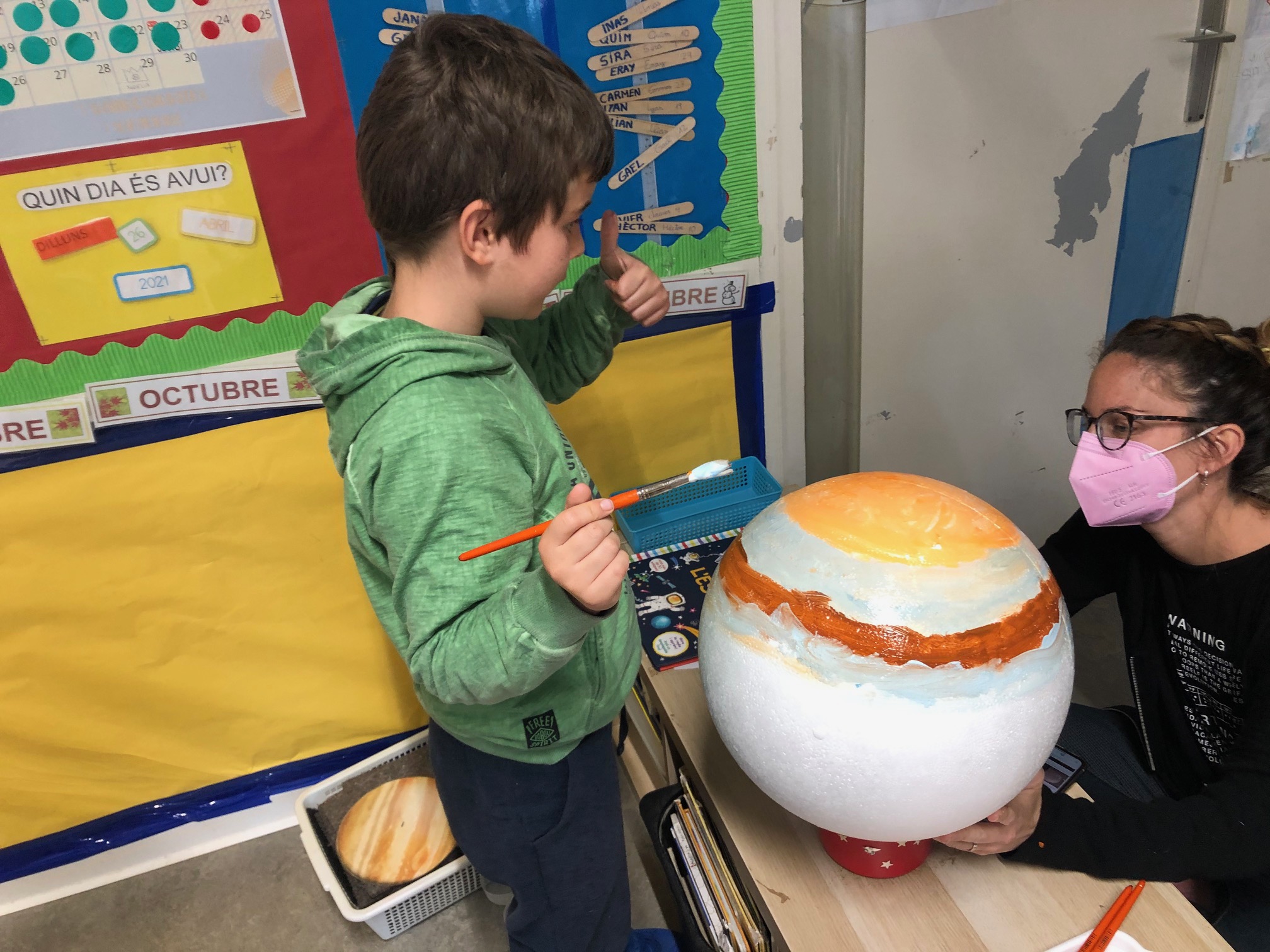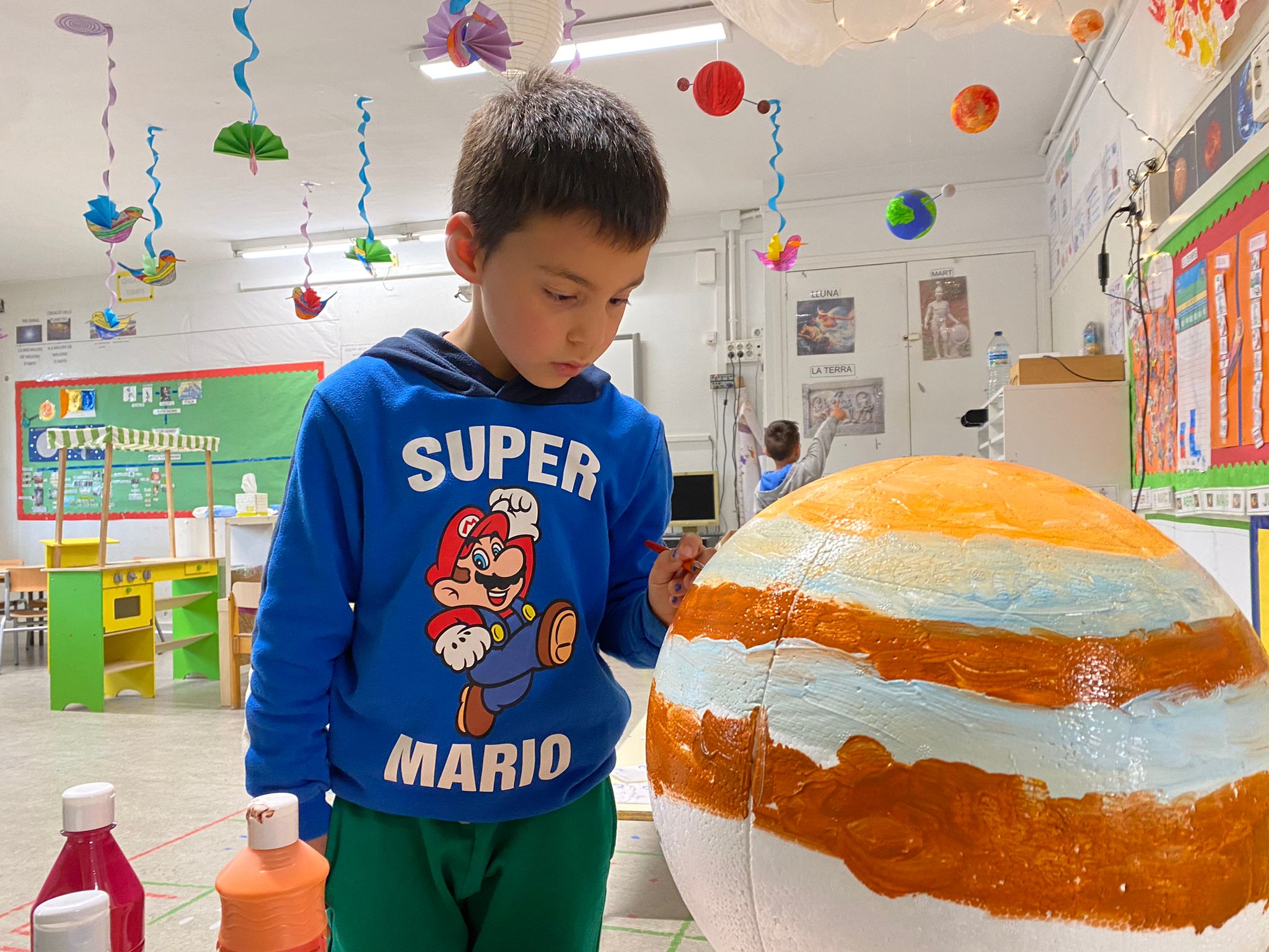 Els infants de P5A continuem el nostre viatge per l’espai i ens endinsem amb els planetes freds i gasosos. Després d’observar el planeta i els seus colors hem descobert que té 79 satèl·lits! Només podem sobrevolar Júpiter, ja que com està fet d’aire no podem aterrar a la seva superfície. El seu nucli té la mateixa mida que la Terra. Comencem a ser veritables experts i expertes en el tema!
