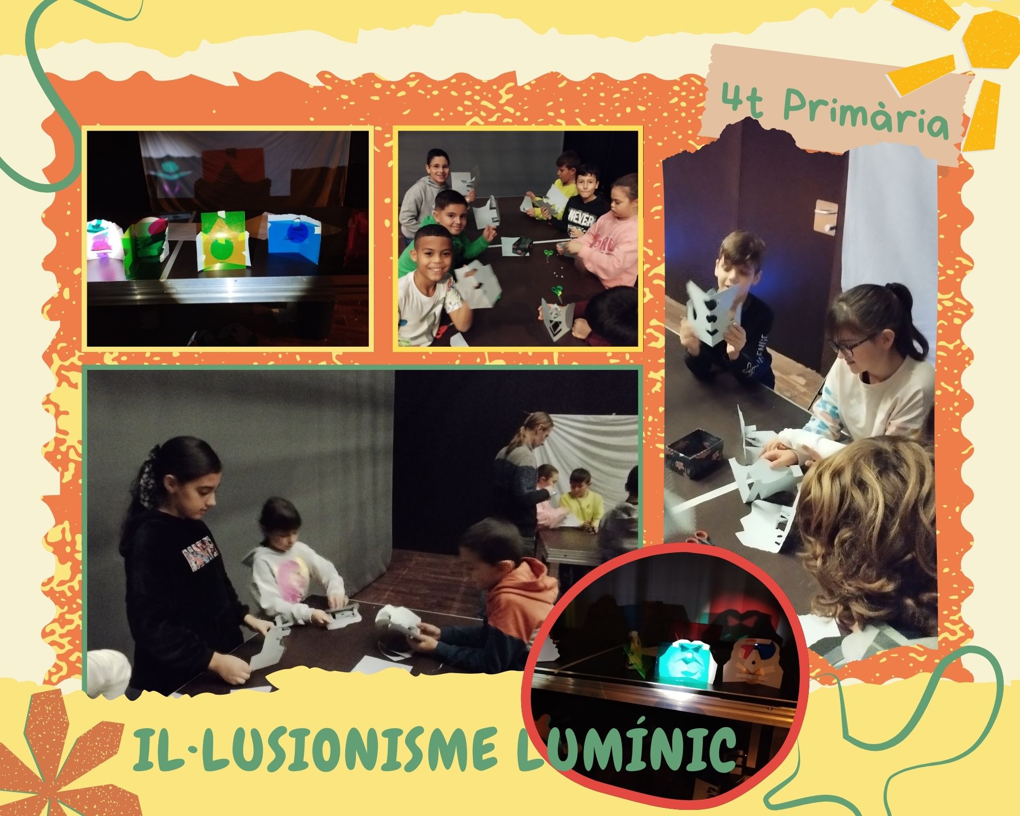 Vam retallar papers donant-lis formes espectaculars, tot seguit vam col·locar plàstics de colors en les nostres construccions i els vam il·luminar amb lots, tot aconseguint ombres de colors amb formes ben estranyes de cares, aus, castells, edificis,…