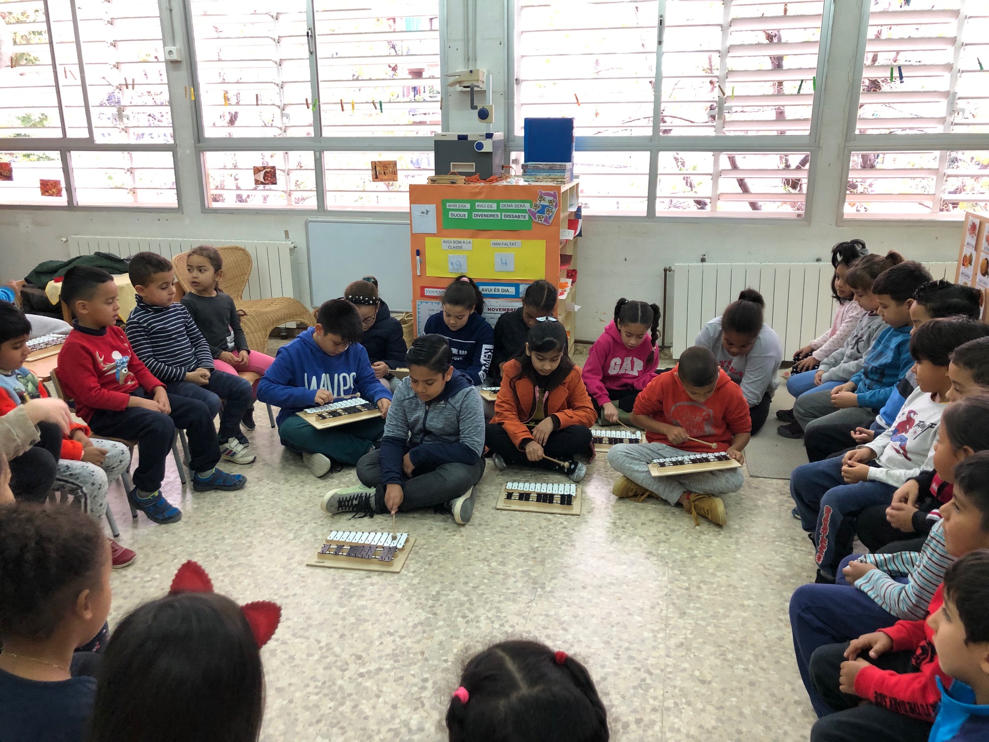 D’una banda els nens de 3r i 5è de primària, interpretaren unes obres que havien treballat a classe amb els metal·lòfons i visitaren l’alumnat d’infantil. A canvi, cada grup d’infantil ens va cantar una cançó.