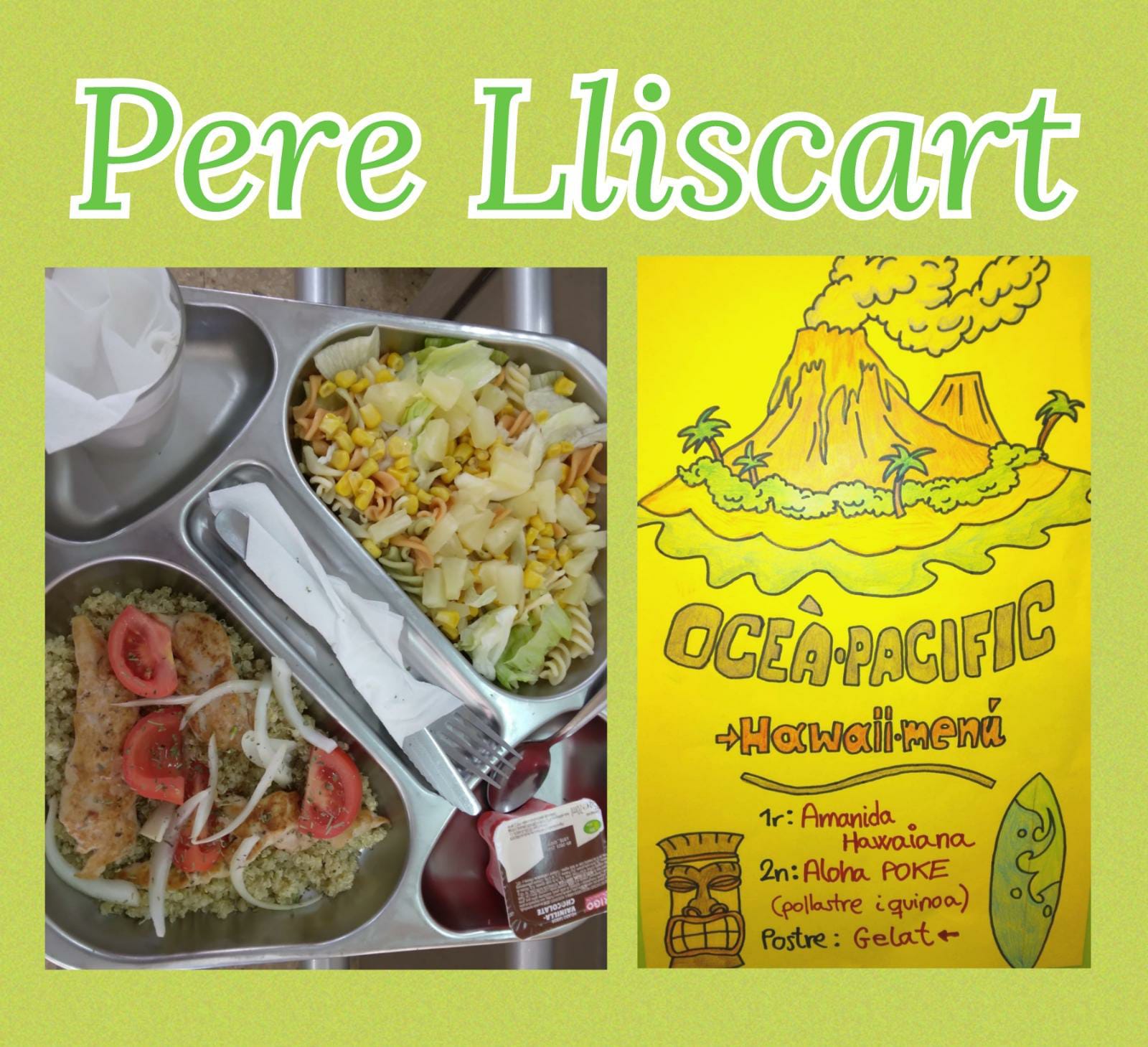 Al menjador ens hem vestit de festa per donar la benvinguda a tots els nens i les nenes amb un ALOHA que significa afecte, amor, pau i respecte… hem gaudit d’aquesta jornada pintant flors hawaianes de colors i collarets per anar ben guarnits, hem decorat el menjador creant un ambient hawaià i hem assaborit un menú típic d’aquesta zona paradisíaca.