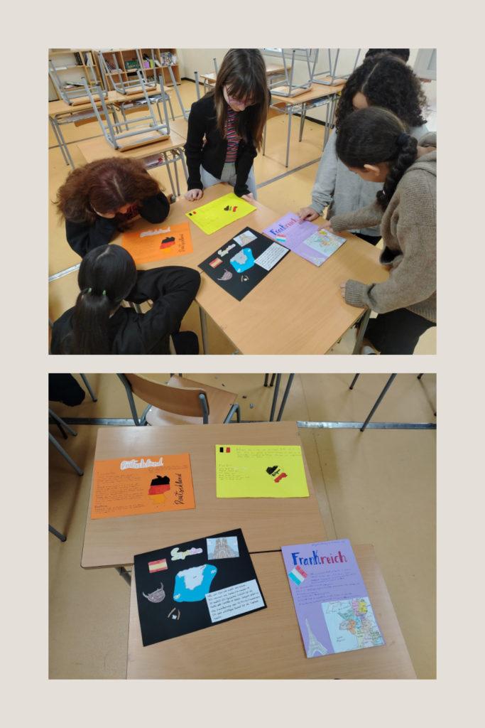 Als pòsters hi han inclòs la capital, la bandera, la moneda, plats típics, monuments i curiositats, i després han exposat el seu treball davant dels companys. Aquesta activitat els ha ajudat a practicar alemany i, alhora, a “viatjar” per Europa sense sortir de l’aula.