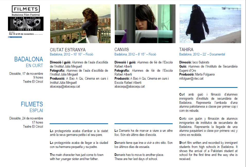 Podreu gaudir de “Canvis“, el nostre curt; juntament amb “Ciutat Estranya“, el curt realitzat pels alumnes de l’Institut Júlia Minguell, i “Tahira“, el documental realitzat per l’alumnat de l’Institut Eugeni d’Ors.