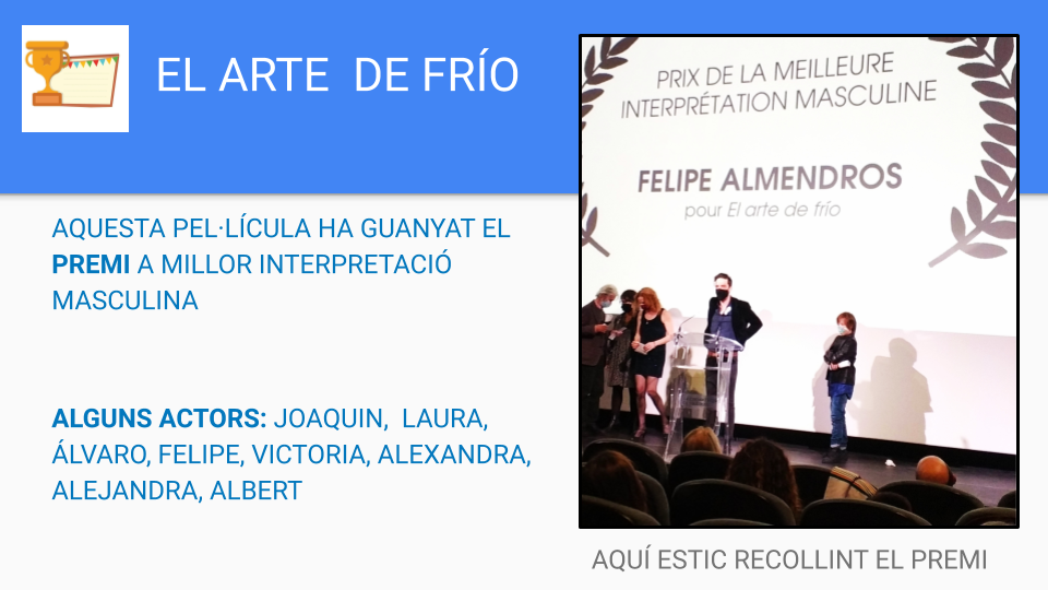 Felicitem de tot cor al Joaquín G. A., alumne de 2n de l’ESO, i al seu tiet Felipe Almendros que la setmana passada van recollir junts el premi de millor interpretació masculina per la pel·lícula “El Arte de Frío” al Festival Cinespaña de Toulouse.