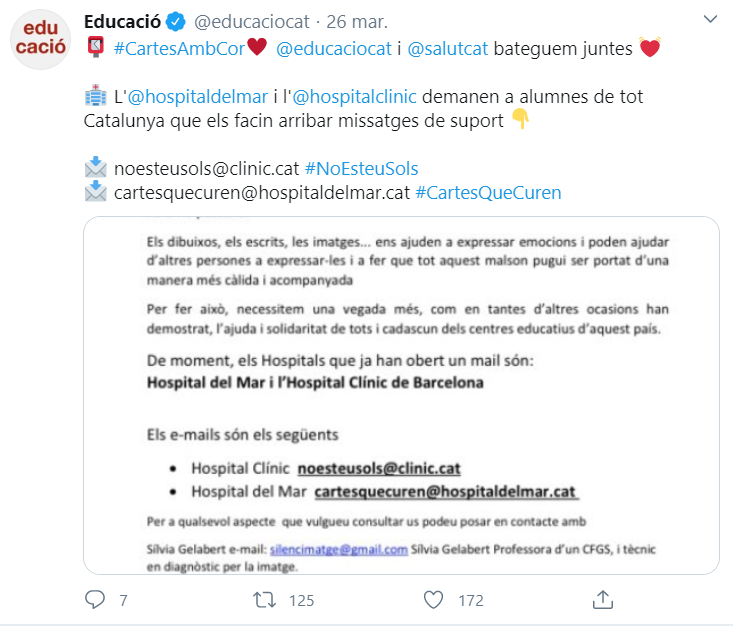EN AQUEST REPTE US PROPOSEM: FER UN DIBUIX, ESCRIURE UN MISSATGE O UNA CARTA PER DONAR ÀNIMS I… Llegeix més»