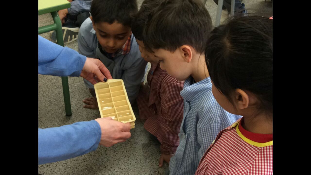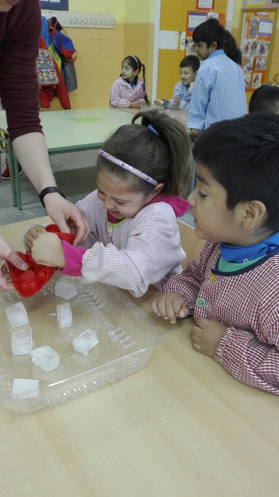 Passat un dia hem anat a buscar la glaçonera al congelador i ens adonem que l’aigua s’ha congelat i s’ha convertit en gel, ara els glaçons els podem agafar amb les mans.