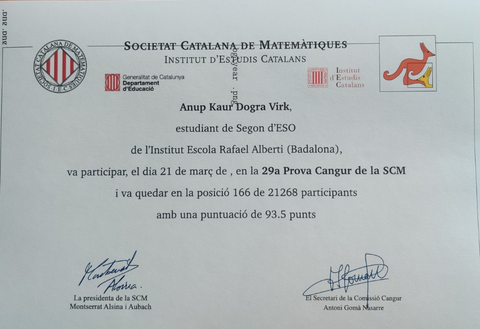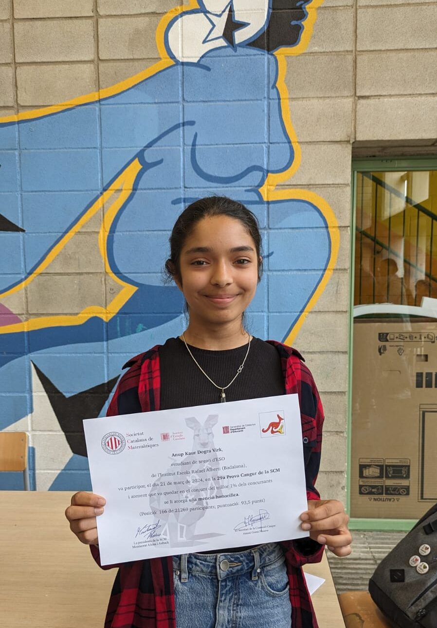 Anup Kaur Dogra Virk (2n ESO), amb el seu destacable rendiment, ha aconseguit situar-se entre el millor 1% de participants, un assoliment que parla del seu talent i dedicació. Amb una puntuació de 93.5 punts i una posició 166 de 21.268 participants (2na de tot Badalona), Anup va demostrar que les matemàtiques poden ser tan emocionants com qualsevol esport.