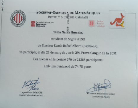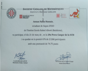 Igualment, els germans Aeman i Talha Naras Hussain (2n ESO) han demostrat les seves habilitats matemàtiques en classificar-se entre el millor 6% de participants (ex-aequo 9è i 10è de Badalona), mostrant que el treball en equip i el suport mutu són claus per a l’èxit. Amb una puntuació de 74.75 punts cadascun, van compartir no només el mateix cognom i data de neixement (són Bessons) sinó també la mateixa puntuació i un talent increïble per a les matemàtiques.