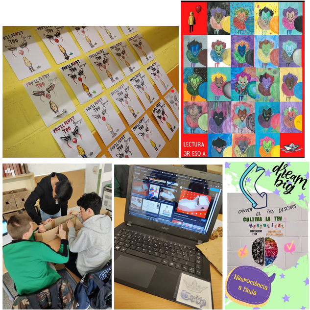 I finalment, l’alumnat de secundària organitza l’espai per fer lectures individuals i col·lectives sobre temàtiques que escull el grup classe, on alguns han aprofitat aquest espai per combinar les arts literàries amb les arts artístiques. Els de 1r ESO han descobert a Roald Dahl i algunes de les seves obres literàries més reconegudes, com per exemple, Charlie i la fàbrica de Xocolata. Els de 2n ESO han volgut endinsar-se amb el gènere de ficció llegint l’obra de Dràcula de l’autor Bram Soker, així com un concurs de poesia japonesa Haiku, on han guanyat un llibre sobre poesia de Joana Raspall. Els grups de 3r ESO han preferit endinsar-se amb les novel·les com el Drac Negre, Mar i Cel, Dràcula, Narracions extraordinàries, It o l’Avaluació del coneixement sobre la mentalitat de creixement en l’aula. Acostumen a acompanyar la lectura amb activitats creatives com podeu veure a les imatges i dur a terme activitats al voltant de la neurociència i fer investigacions a partir de la lectura d’articles. I finalment, els de 4t d’ESO també han aprofitat per apropar-se al món literari i poètic del projecte de l’Alberti.