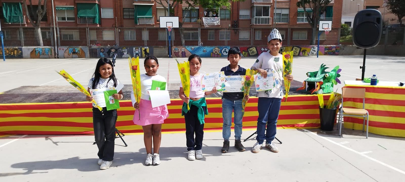 Després del pati a cada aula es va explicar la Llegenda de Sant Jordi i a la tarda, junt a la resta de companys i companyes es van celebrar jocs florals on cada grup ha cantat una cançò i ha recitat un poema.