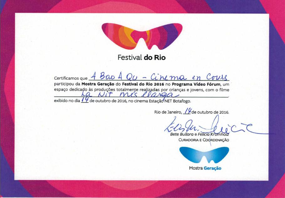 El proper 14 d’octubre de 2016, en el marc de la ‘Mostra Geraçao’ del Festival do Rio, es projecta el film La nit més llarga, realitzat pels alumnes de l’Escola Rafael Alberti a Cinema en curs 2015-2016.