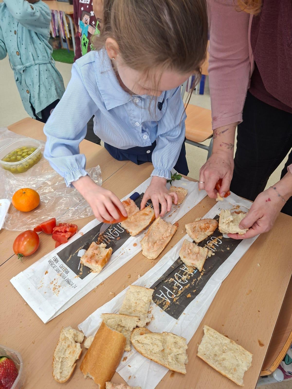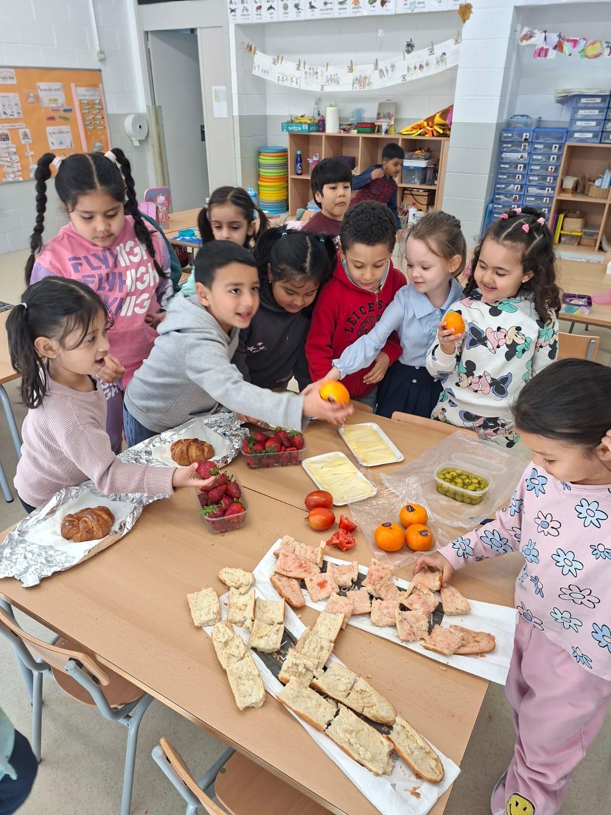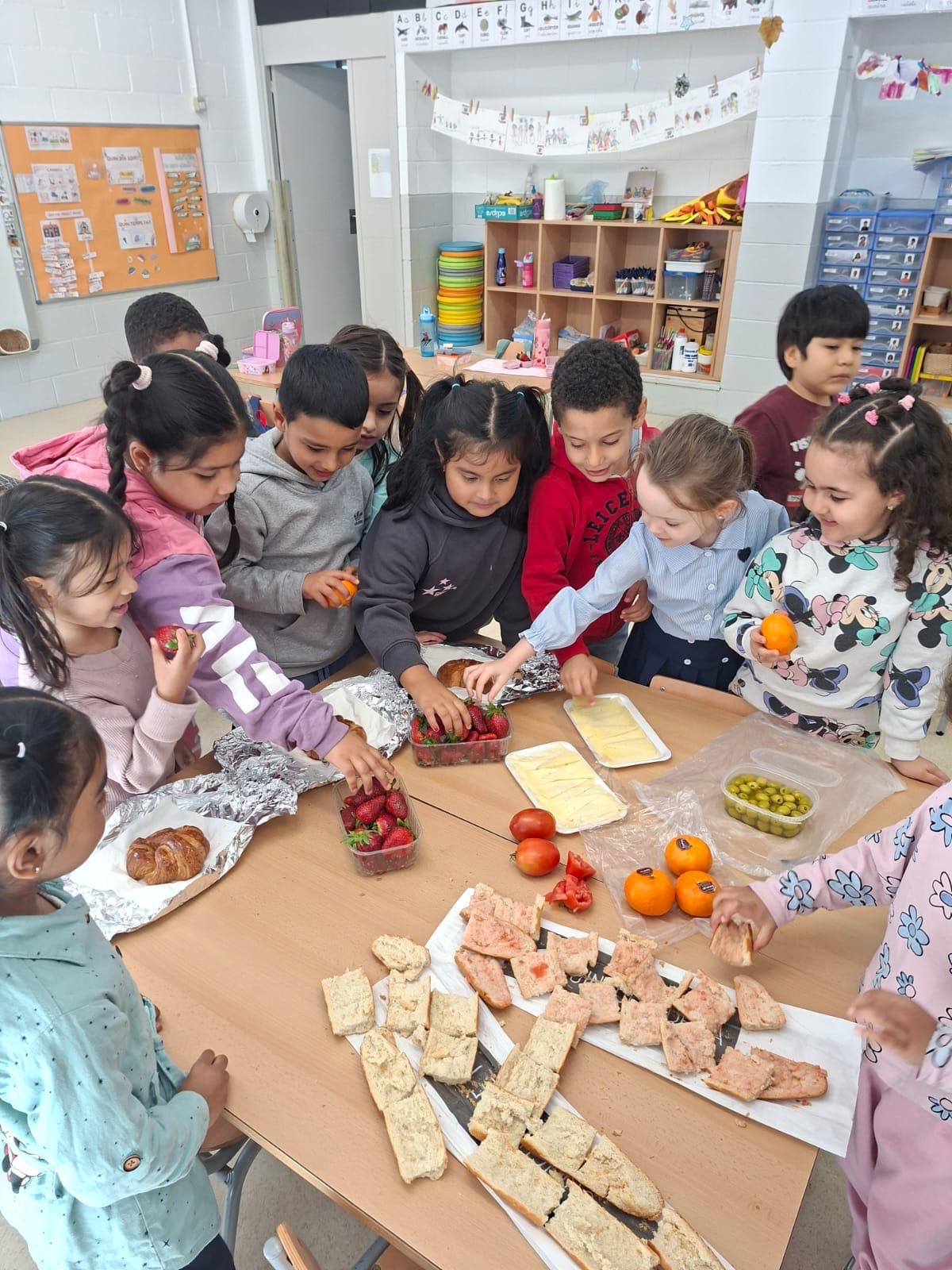 Amb els productes comprats al mercat, els infants han preparat conjuntament un esmorzar saludable a l’escola. Entre tots i totes han preparat el pa amb tomàquet,el formatge, les olives i han compartit també diferents peces de fruita.