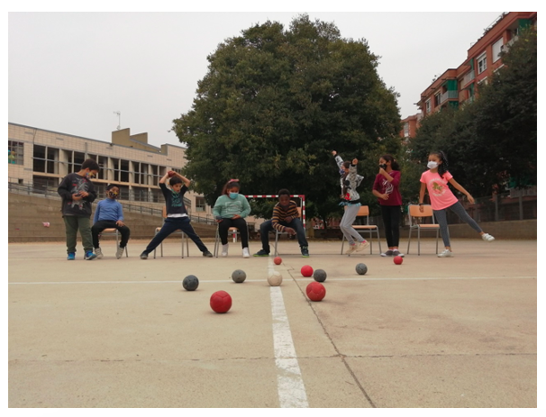 I l’altre part era més pràctica. El grup va sortir a la pista de l’escola i allà hi havia dues activitats esportives adaptades on van poder participar i posar-se a la pell d’una persona amb discapacitat; el bàsquet amb cadira de rodes i la “petanca” amb cadires fixes.