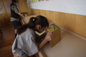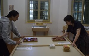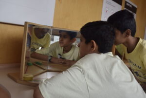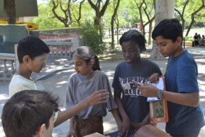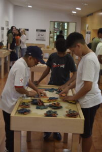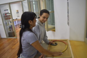 Però no: al museu de les matemàtiques s’hi va per jugar, tocar, moure i explorar. Acompanyats per l’Íñigo, la Lluïsa, la Vit i el Luca, les classes de 1r A i 1r B van prendre part a una gimcana amb preguntes de lògica i de matemàtica, i a una visita guiada de 75 minuts pels ambients del palau que és la seu del museu. Explorant el món dels números, de les fraccions, de la probabilitat, dels miralls i de la geometria.