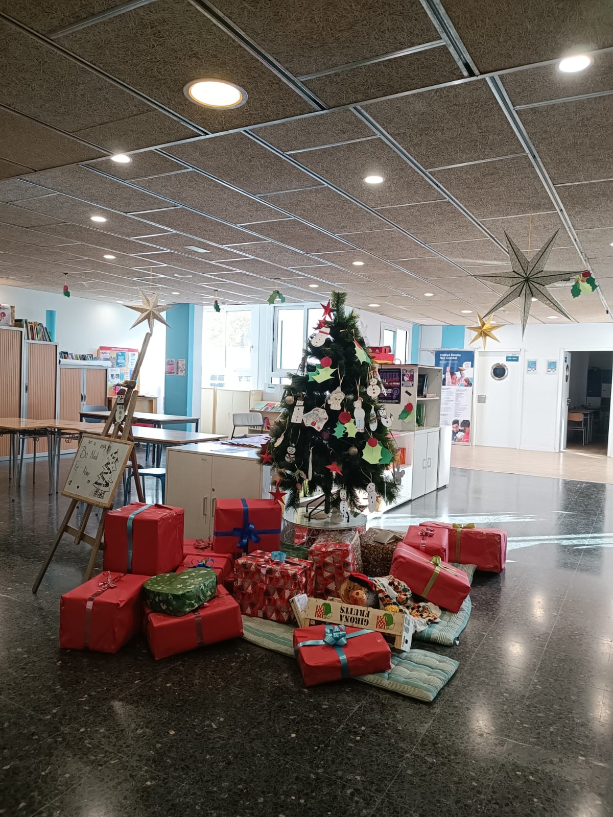 L’alumnat de primer de l’ESO ha après a fer estrelles de 6 i 8 puntes amb regles i compassos per decorar un geomètricament preciós arbre penjat a la paret. Els ninots de neu els han fet alumnes de 1r, 2n i 3r, mentre els de 4t han preparat les estrelles per l’arbre, juntament amb l’alumnat del PDC, que ha ajudat a penjar les decoracions del sostre.