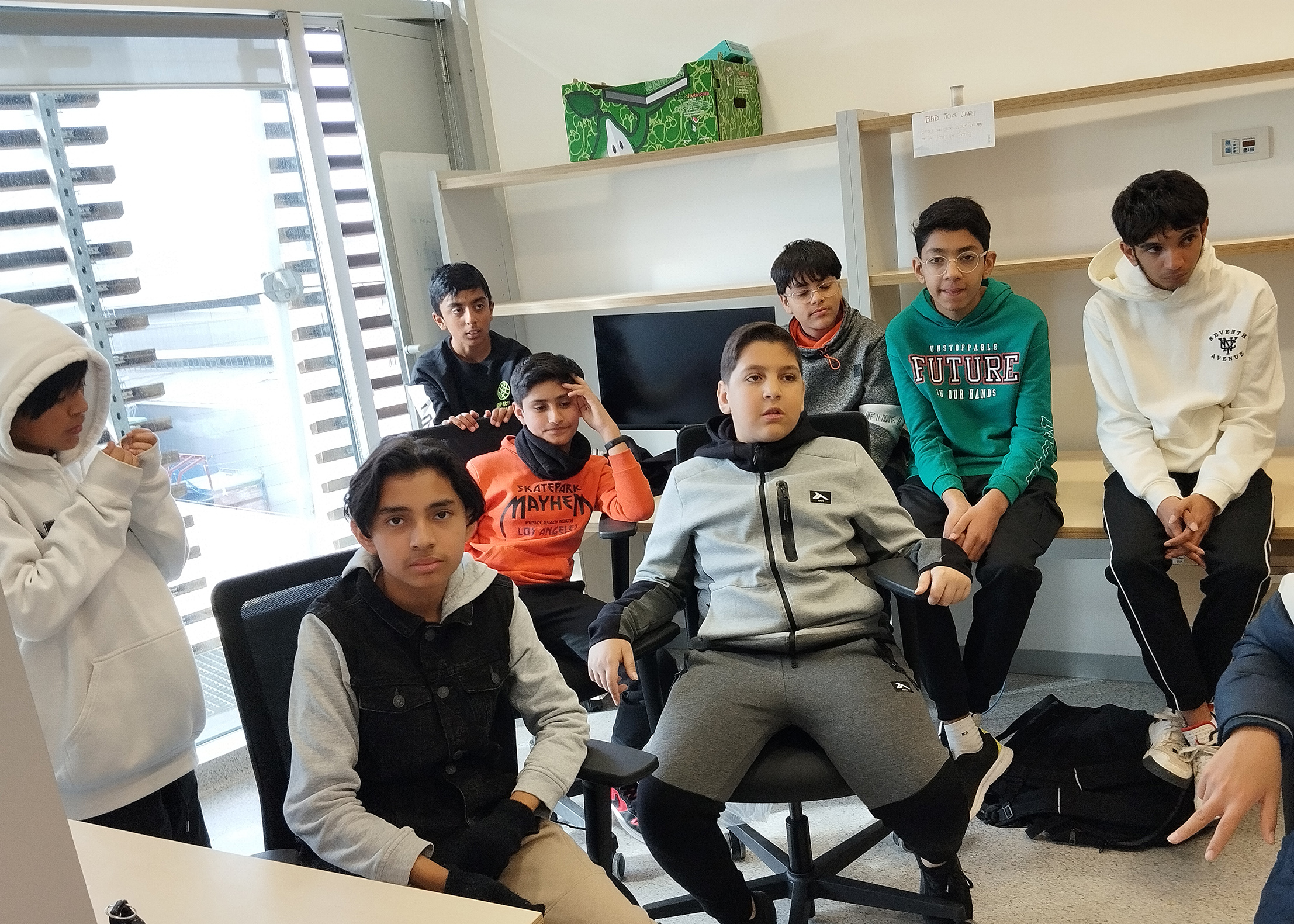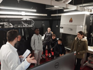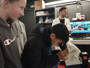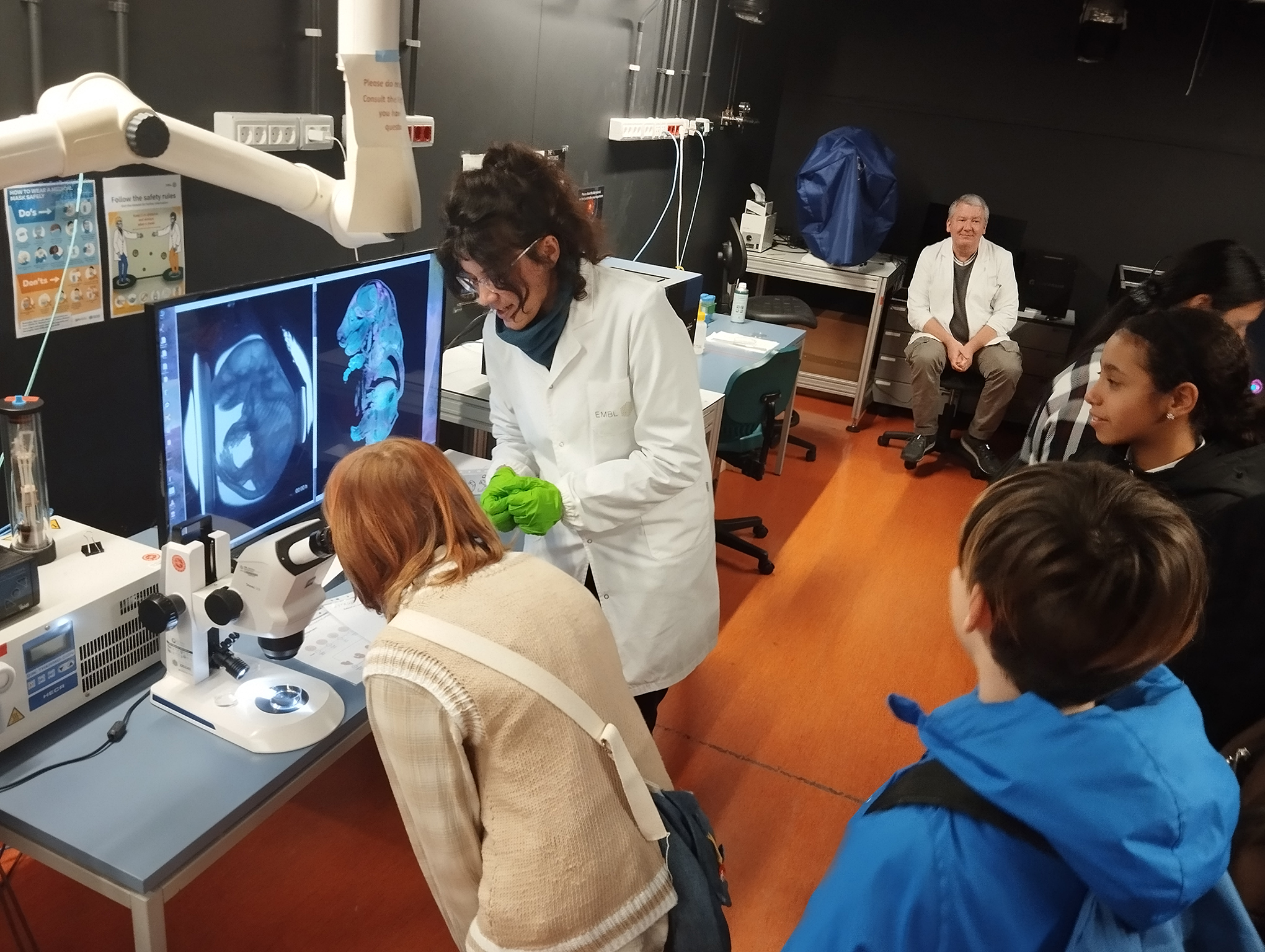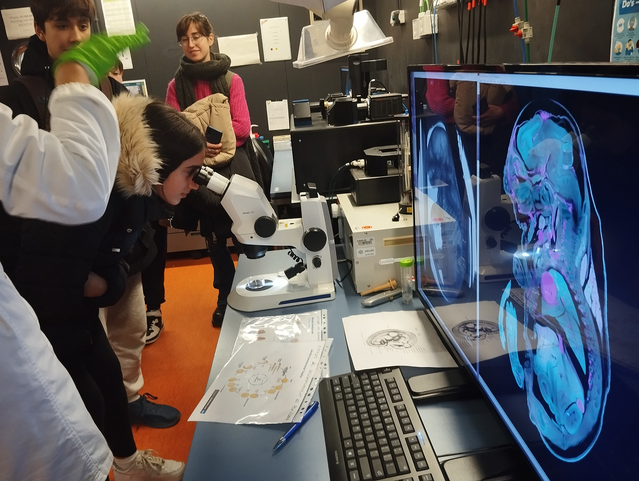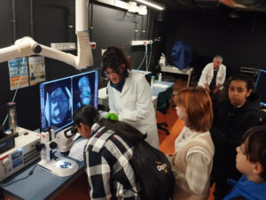 Allà, un equip d’amabilíssims voluntaris de tres laboratoris diferents han guiat l’alumnat, explicant-los la recerca que fan: l’Heura Cardona, que estudia com es formen les extremitats superiors dels mamífers, el Waleed Mirza i el Quim Frigola que, fent servir un bròquil, han explicat els intríngulis de la modelització computacional dels sistemes multicel·lulars, i finalment el Jim Swoger i la Gopi Shah que (juntament amb el Nicola Gritti i la Montserrat Coll) han fet descobrir un microscopi molt sofisticat anomenat Mesoscopic Imaging Facility, i han pogut mirar les espectaculars imatges d’éssers vius amb les quals es fa molta investigació científica. Fins i tot, han pogut conèixer la persona que va construir amb les seves mans el microscopi que es fa servir per les investigacions.