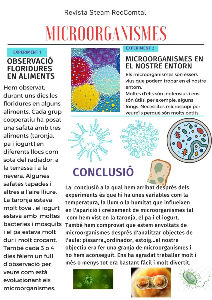 Dins l’àmbit de Steam i durant aquest segon trimestre, els alumnes de sisè hem treballat el projecte dels microorganismes. A través de l’observació i l’experimentació s’ha aconseguit engrescar i motivar l’alumnat des de l’inici, prenent consciència de quins són els aspectes fonamentals per a l’existència dels microorganismes en tot allò que ens envolta. Un primer experiment s’ha basat en l’observació del procés de creixement de floridures en aliments com la taronja, el iogurt i el pa, mentre que el segon experiment ha estat aconseguir i analitzar la presència de microorganismes en elements que trobem en una aula. Un cop finalitzats aquests experiments, l’alumnat ha sigut capaç d’arribar a certes conclusions sobre aquest tema les quals han quedat recollides en un article.