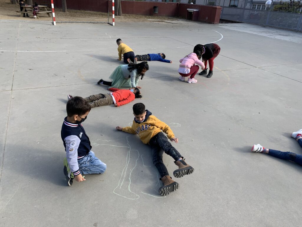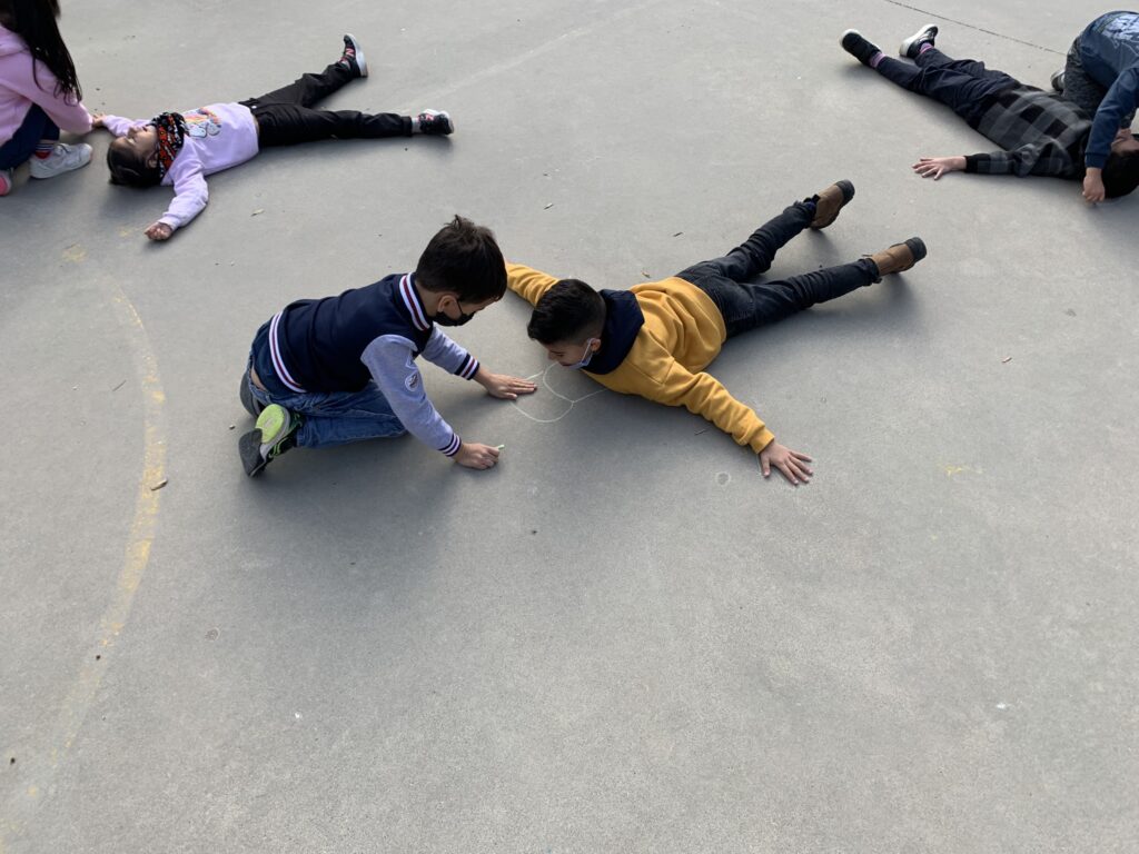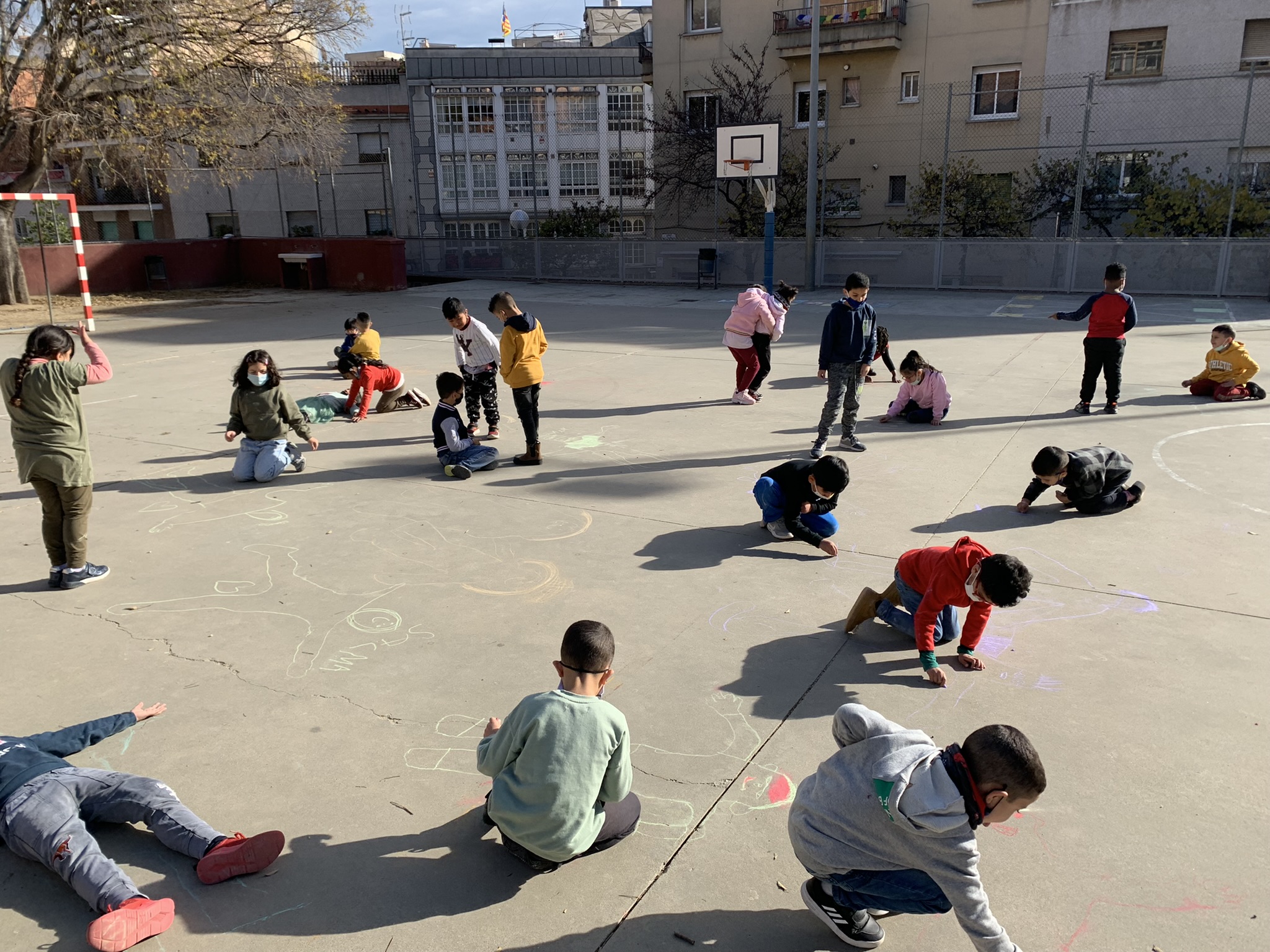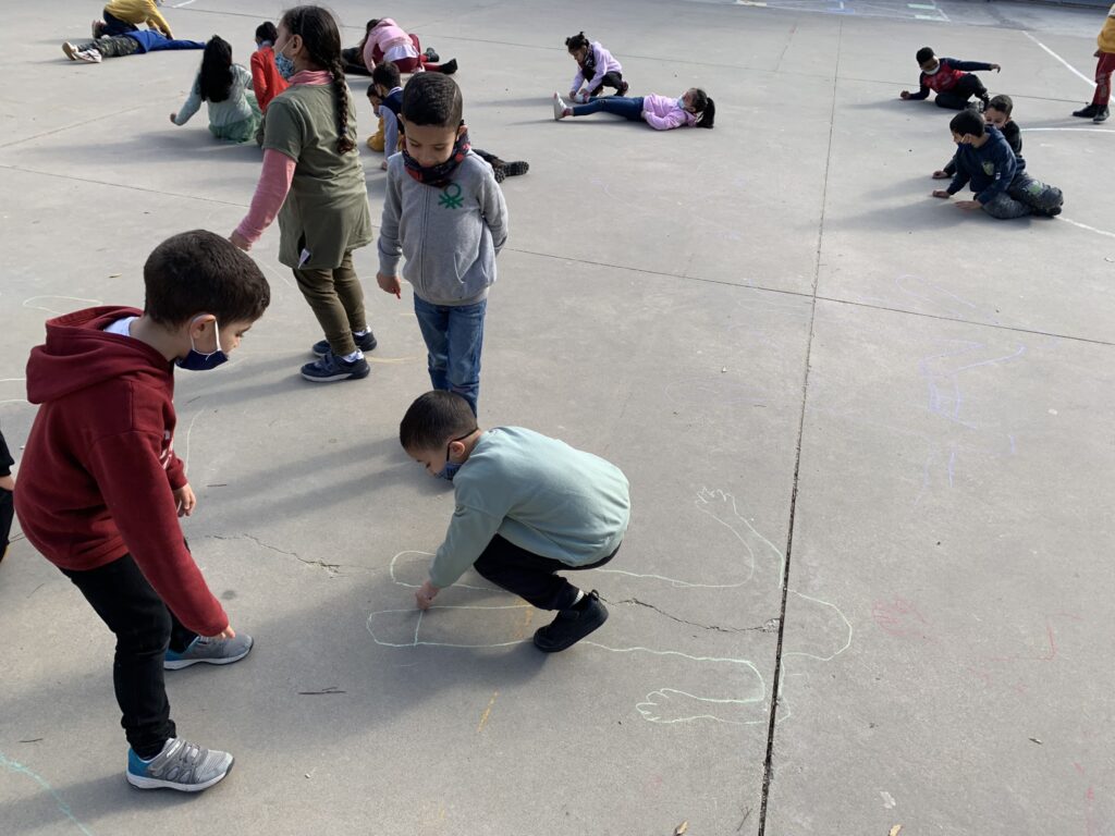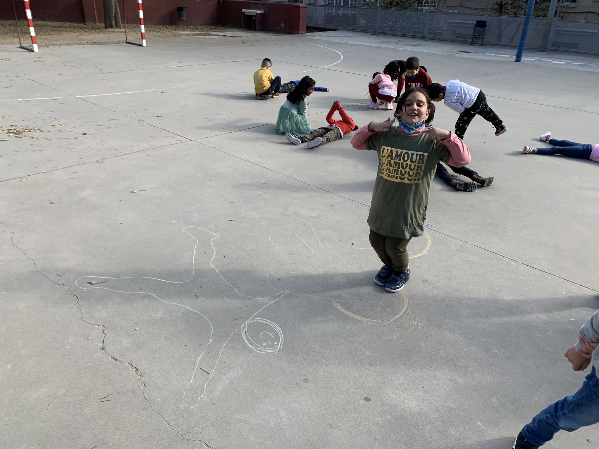 Finalment, vam anar al pati i vam gaudir d’una estona compartida els grups de primer. Va ser una gran oportunitat per passar-ho bé aprenent perquè van dibuixar-se per parelles amb guixos al terra del pati i van poder posar nom a les diferents parts del cos.