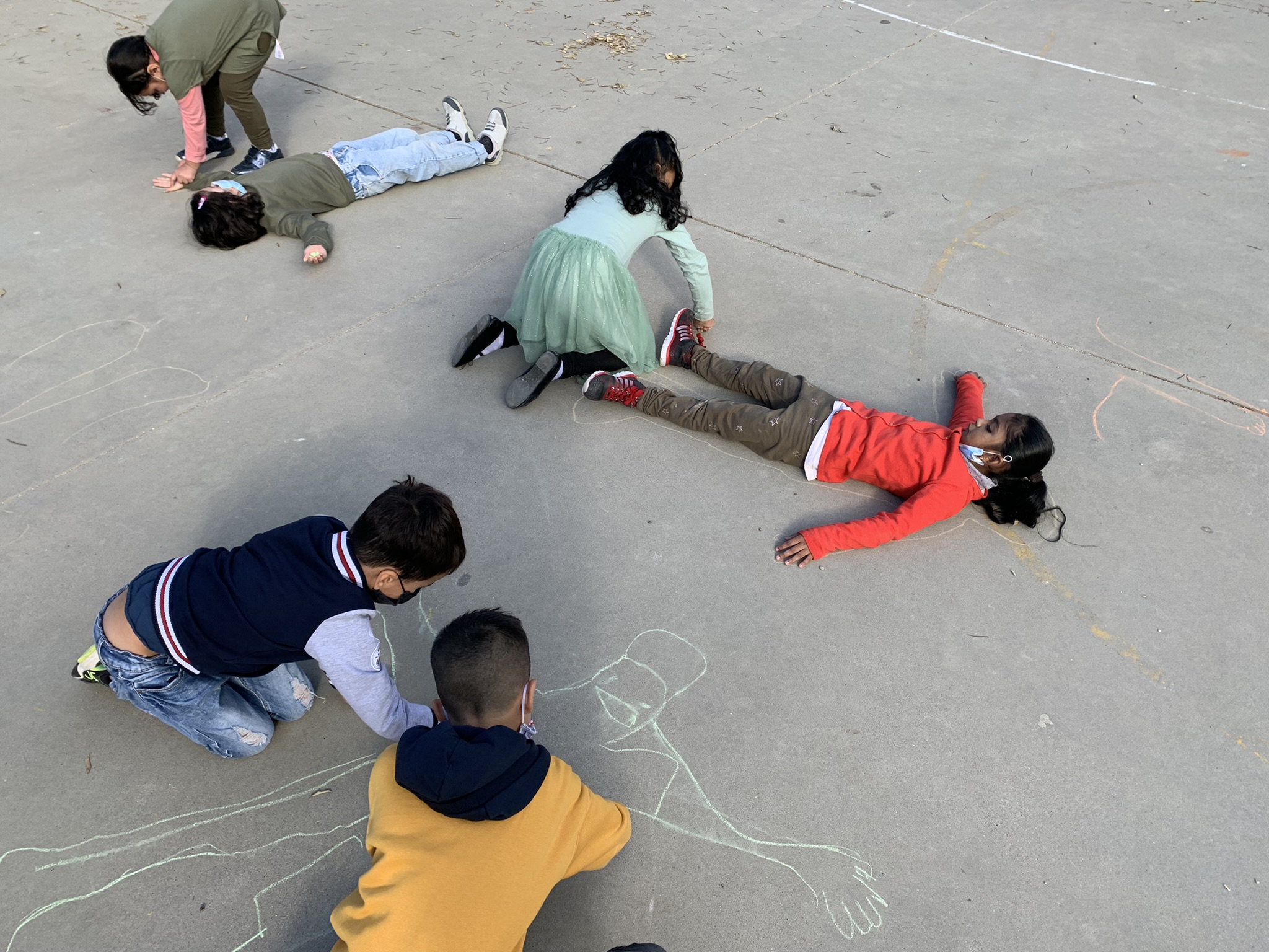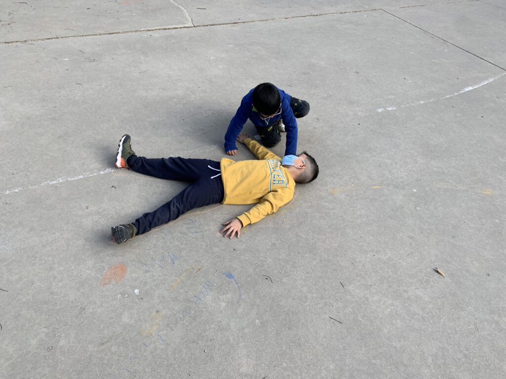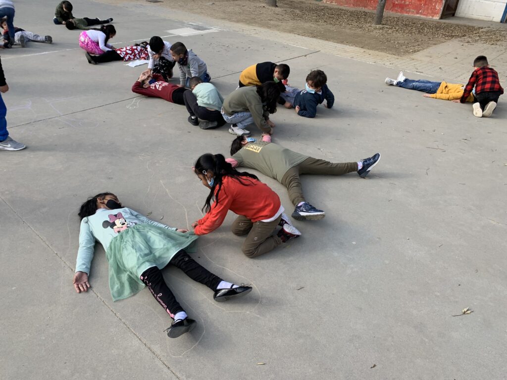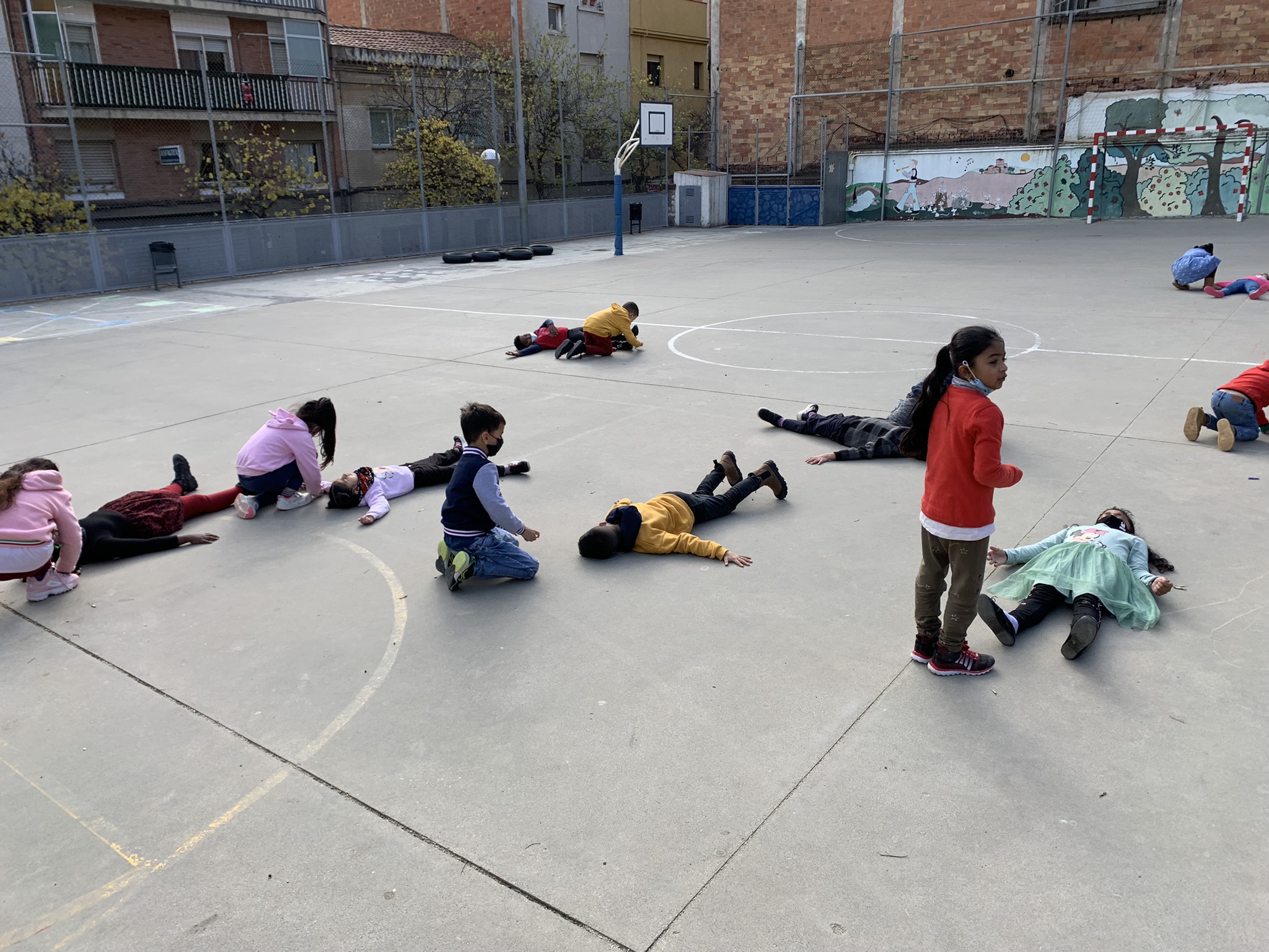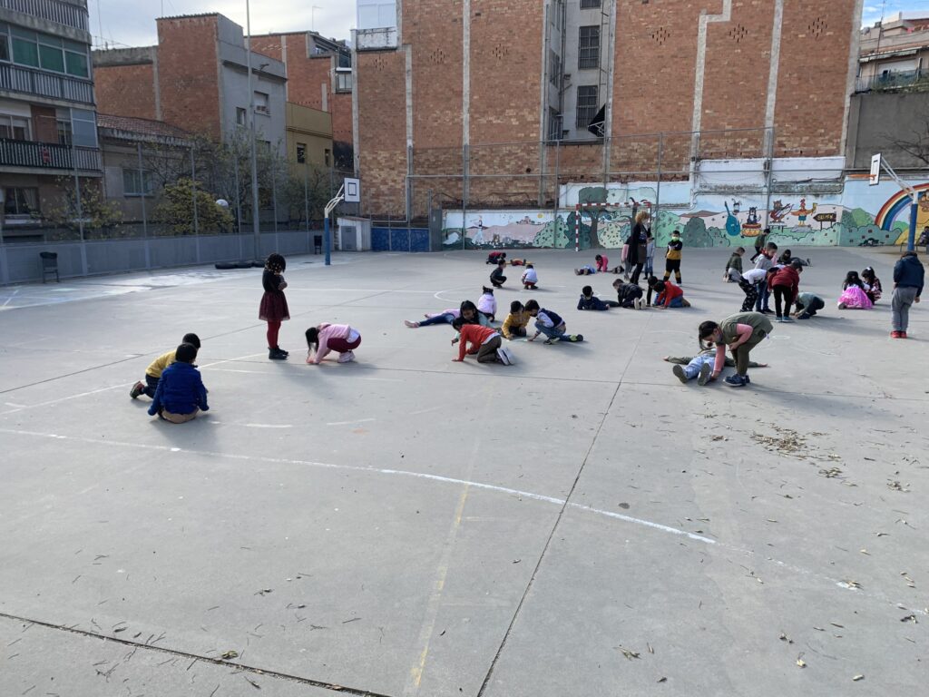 Finalment, vam anar al pati i vam gaudir d’una estona compartida els grups de primer. Va ser una gran oportunitat per passar-ho bé aprenent perquè van dibuixar-se per parelles amb guixos al terra del pati i van poder posar nom a les diferents parts del cos.